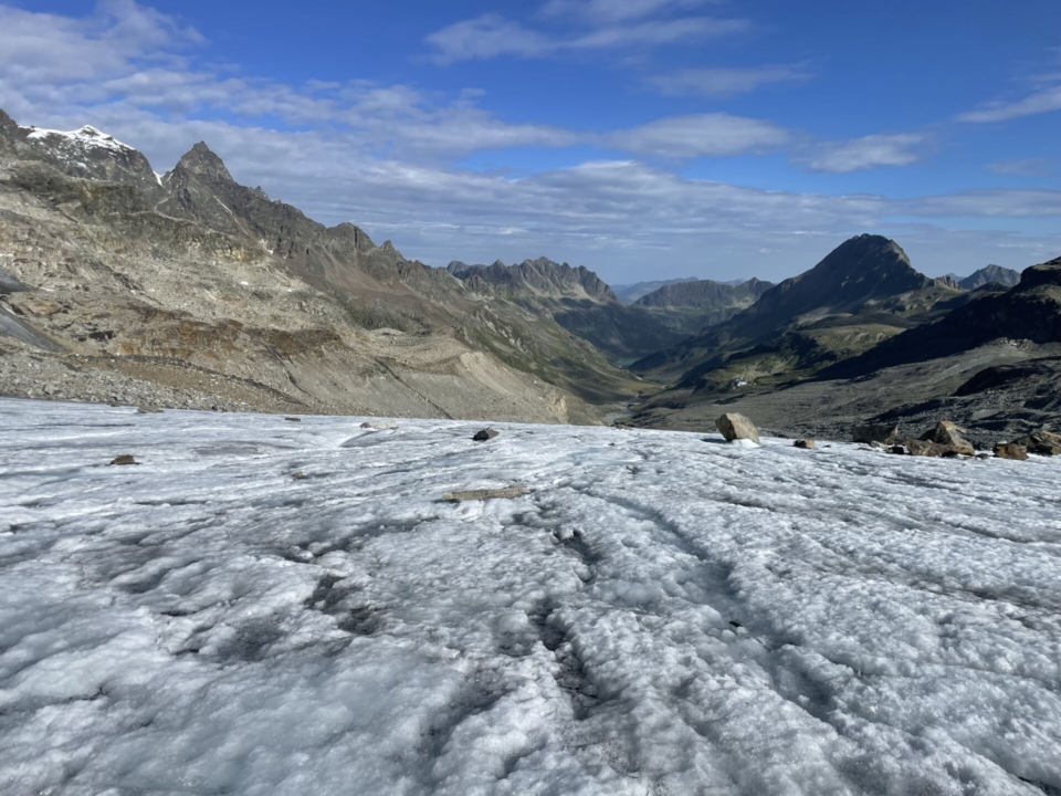 Gletscherbegehungen machen immer Spass, solange sie nicht zu lange dauern. Das Knirschen des spröden Eises unter den Füssen, die eingeschmolzenen Steine, das Rieseln des Schmelzwassers, das im Verlauf des Tages zu einem Bach anschwellen wird. I love it! Nach einer guten Viertelstunde ist der Spass vorbei und einen kurzen Schlussspurt über Geröll später stehe ich in der Lücke und klopfe vergnügt auf das Grenzschild: „Ciao Schwizz, ich bin wieder dihei“!