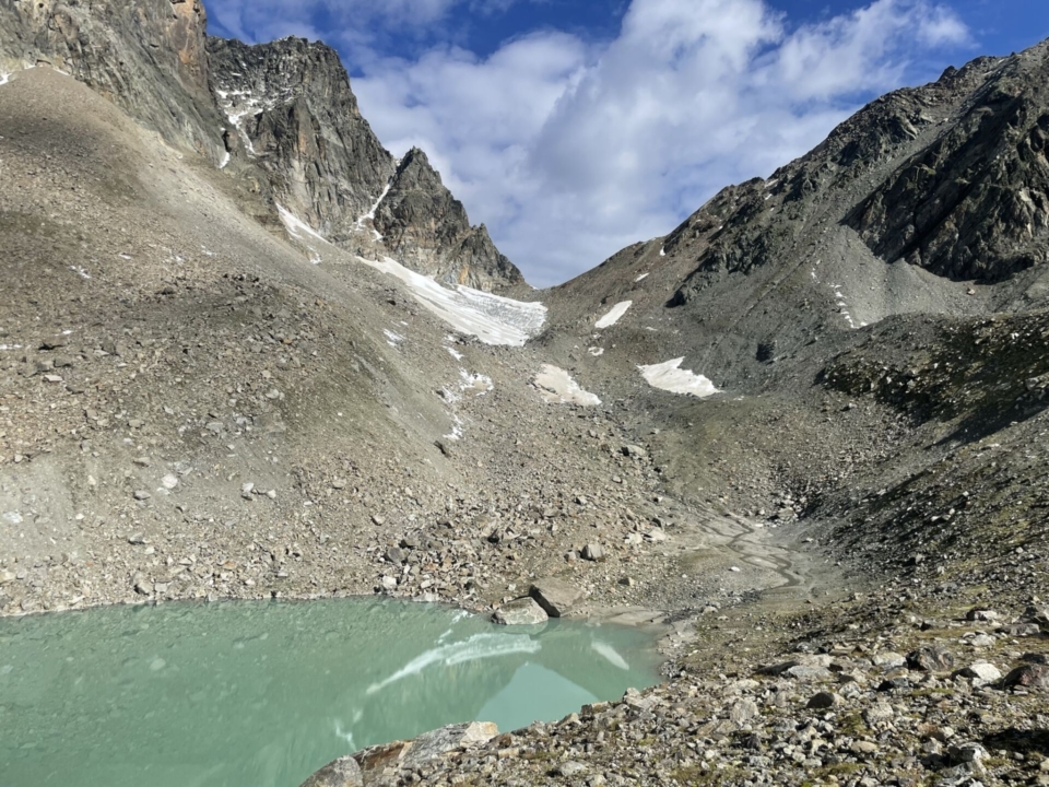 Das ist natürlich nur symbolisch, denn zuhause will man hier trotz aller Schönheit nicht wirklich sein. Aus der Seitenwand des Piz Buins donnern nämlich schon am frühen Morgen immer wieder Steine in das Couloir, in das ich jetzt hinuntersteige. Das ist übrigens auf den ersten 100 Metern auch nicht ganz einfach. Zunächst hilft zwar eine Spur durch das grobe Geröll, dann wird es blockig. Ich bewege mich zum östlichen Rand des Gletscherchens hin und steige über das Eis ab. Das geht einfacher und wesentlicher schneller als durch die Blöcke (Schwierigkeit: ganz kurz T5, dann wieder T4+). Aber bitte wirklich östlich bleiben…der Steinschlag lässt grüssen! Bald flacht das Eis ab und es läuft sich leichter. Es folgt ein einfacher Abstieg durch Geröll und über ein Schneefeld zum Gletscherseeli, wo ich mir eine kurze Pause gönne um die eindrückliche Wand des Piz Buins nochmals zu studieren. Von dort an gibt es auch wieder einen guten Pfad, der steil aber wenig schwierig zur Tuoihütte hinunter führt, wo „die Zivilisation“ wieder erreicht wird.