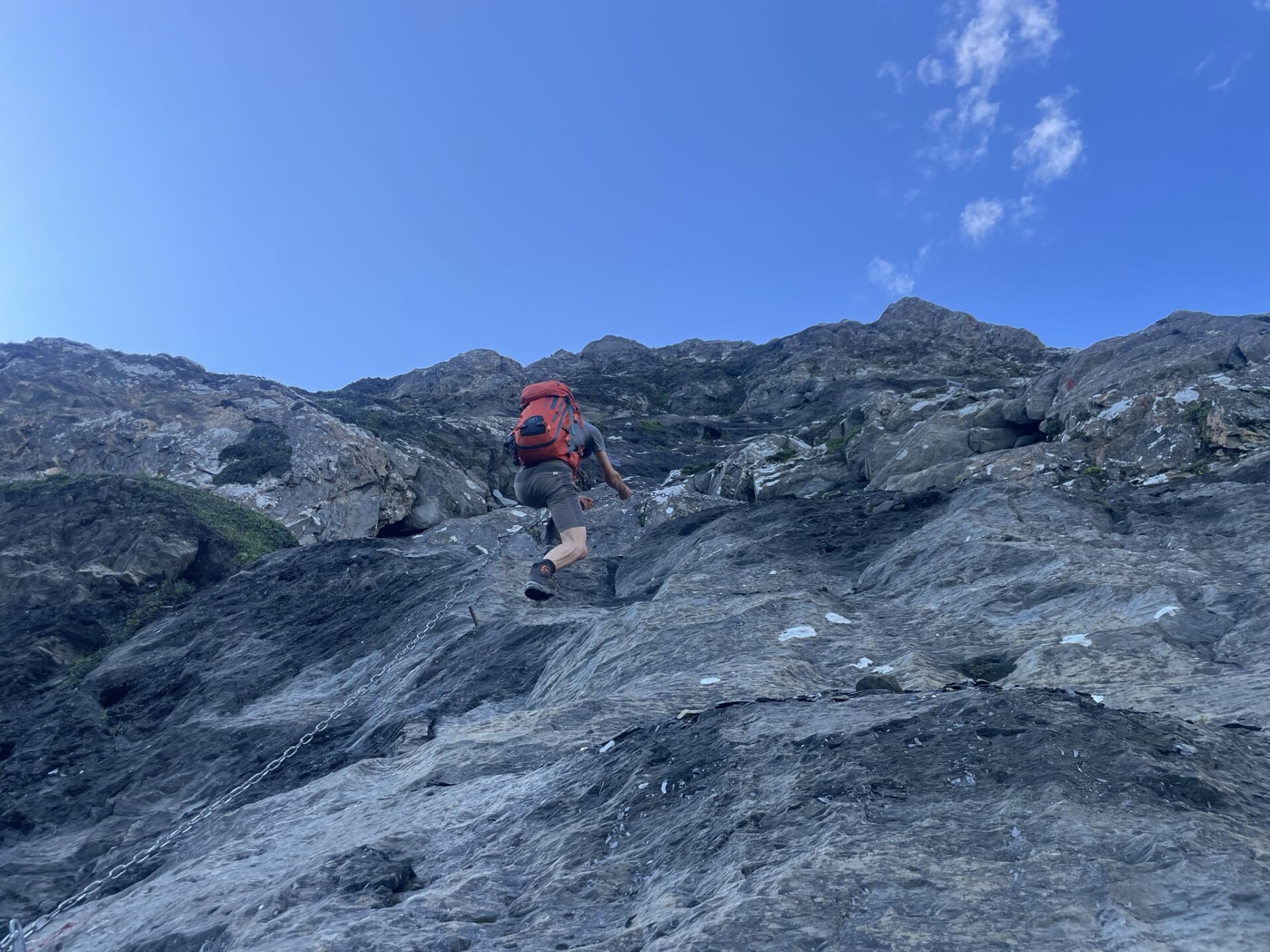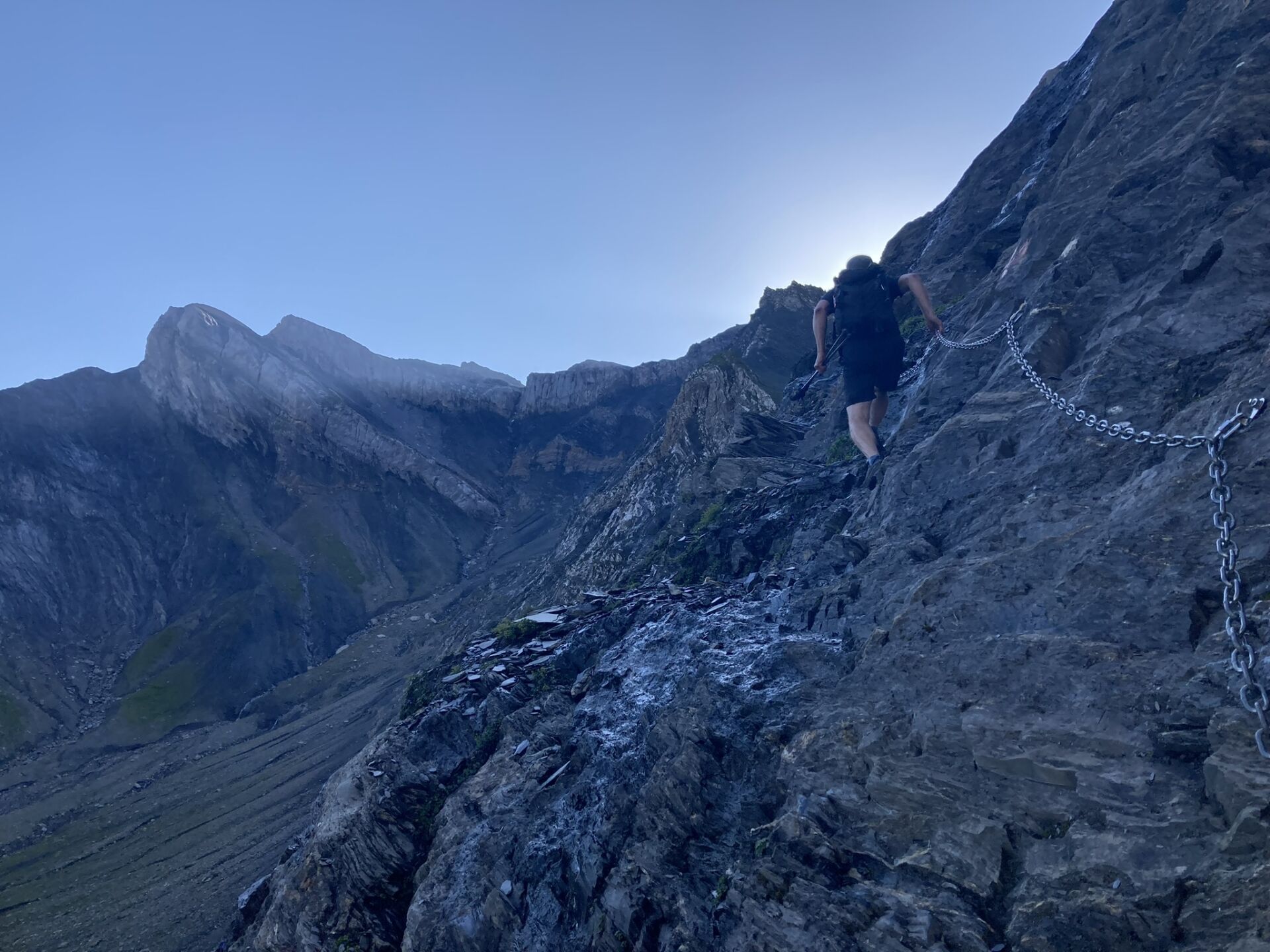 Jetzt geht es blau-weiss markiert weiter. Zunächst folgt der nervenkitzelnde Durchstieg durch das berüchtigte Schwarzwändli, ein inzwischen sehr gut ausgebauter Kettenweg. Ohne dieses Hilfmittel wäre dies Kletterei der Stufe II, und da diese Nordseite gerne feucht ist auch nicht ganz ungefährlich. Aber eben – so wie heute angetroffen ein grosser Spass, den wir hier auch gerne fotografisch dokumentieren.