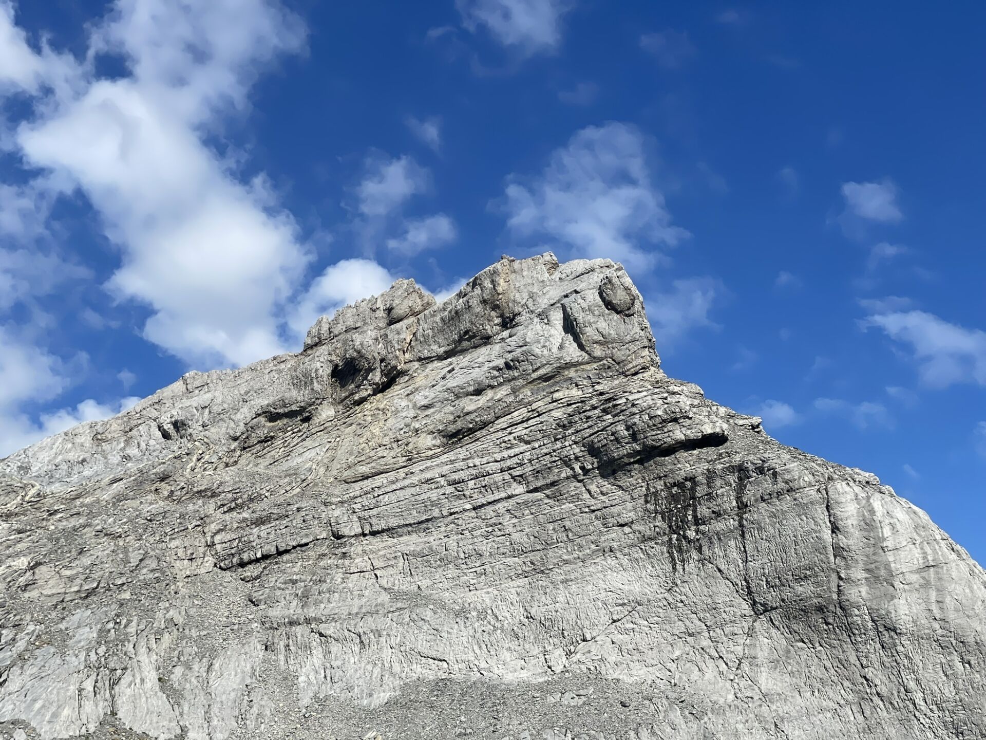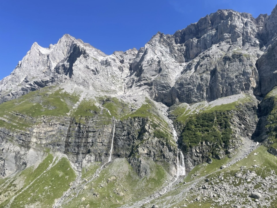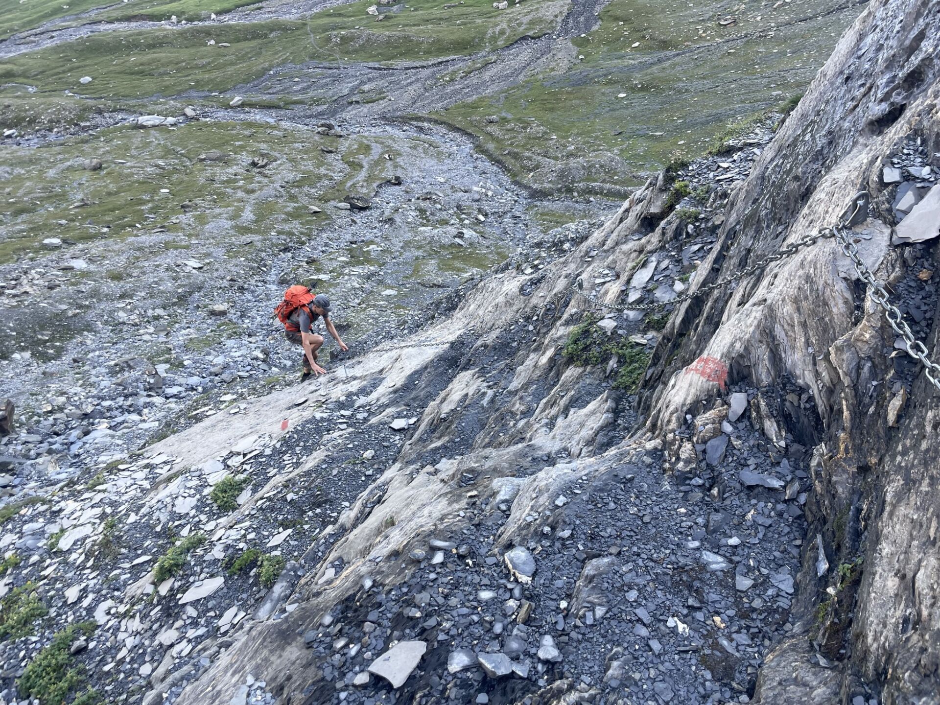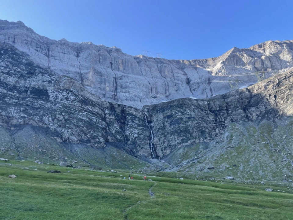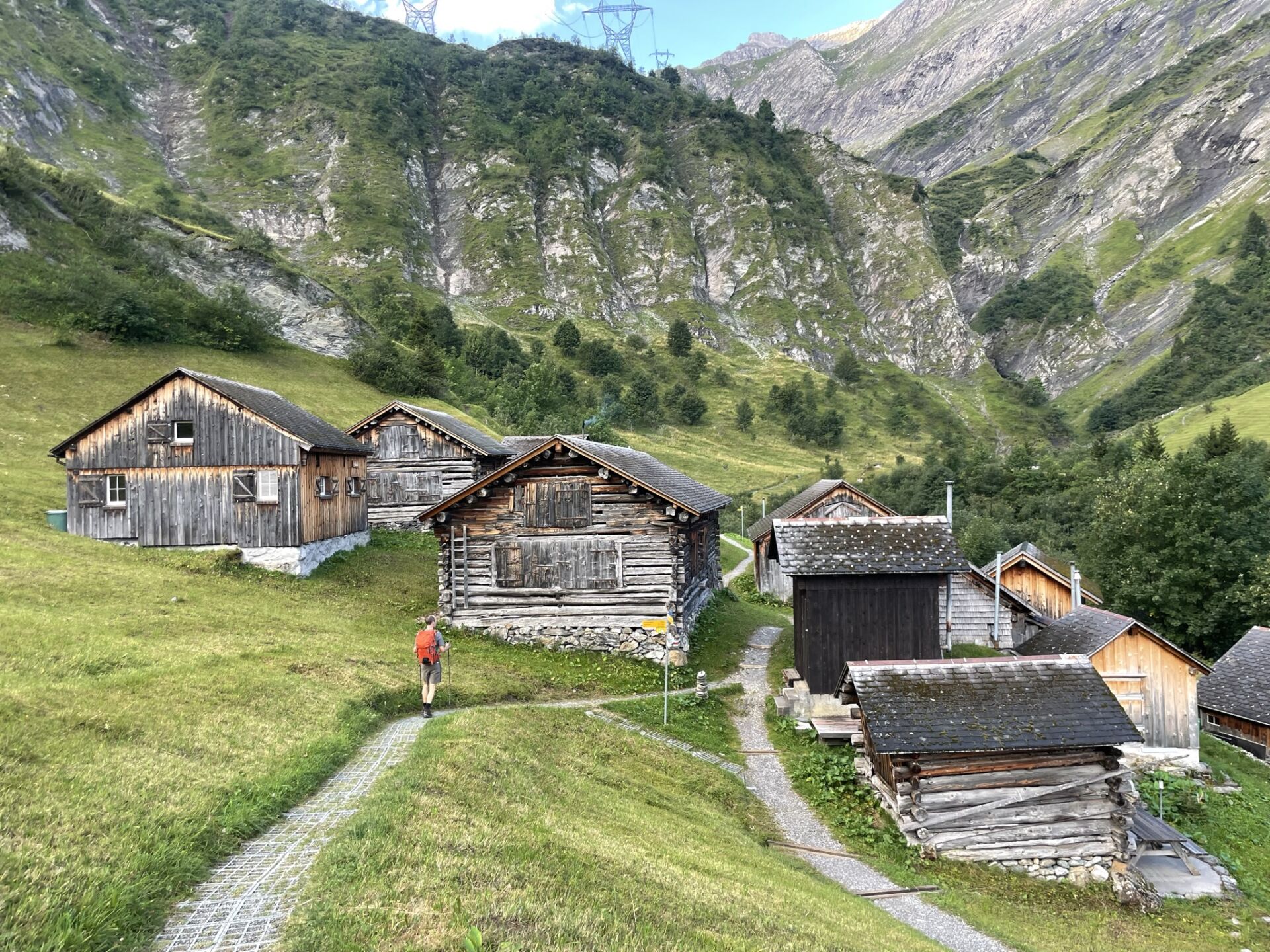 Das ändert sich auch nicht mehr beim Abstieg durch die Karrenfelder zum Panixerpass und der Fortsetzung in „entgegengesetzter Suworow-Richtung“ über den Saumpfad hinunter ins Tal. Hin und wieder bleiben wir stehen, um die enorme Wand neben uns, auf der wir vor kurzem noch traversierten, zu bestaunen.