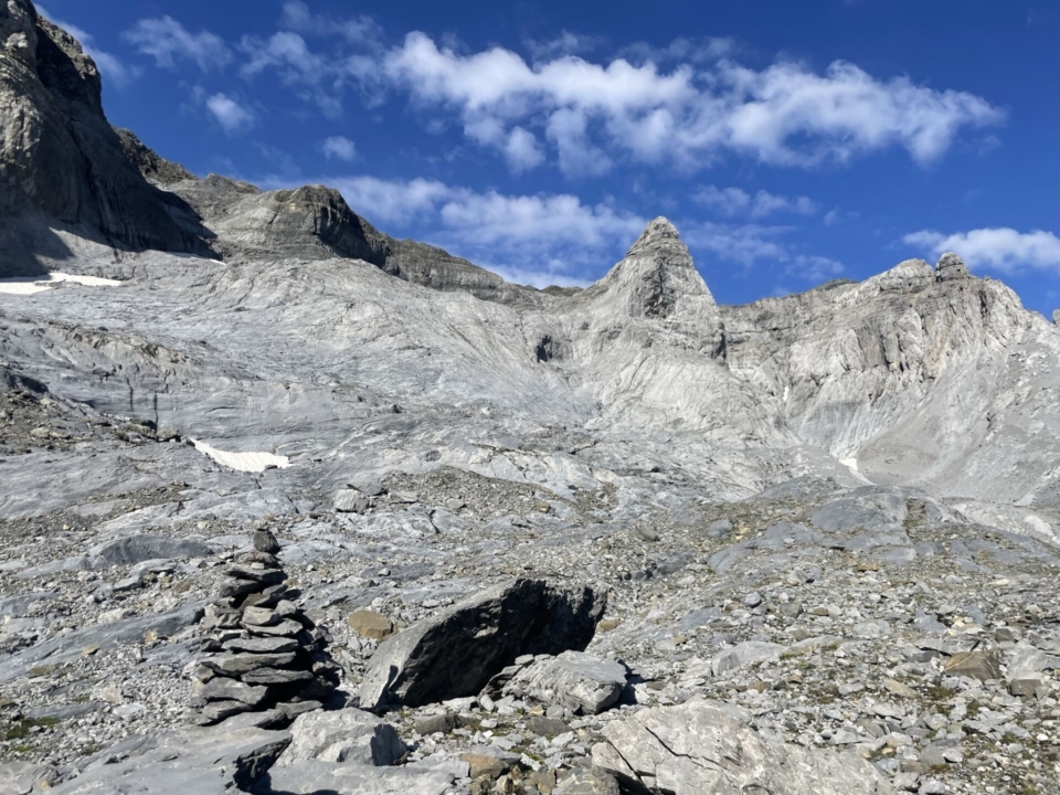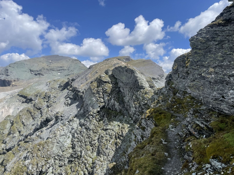 Nun stehen wir vor einer noch höheren, unüberwindbaren Wand, die uns von Graubünden trennt. Diese wird aber über Geröll, Platten und Blöcke problemlos in westlicher Richtung umgangen. Das macht ebenfalls wirklich Spass und die skurillen Felsformationen in dieser Umgebung machen den Aufstieg zum Kinoerlebnis. Die 500 Höhenmeter schmelzen nur so weg.