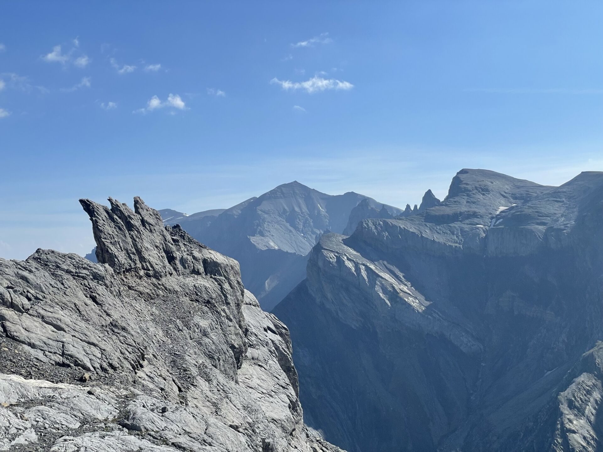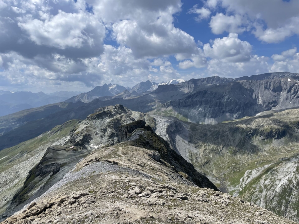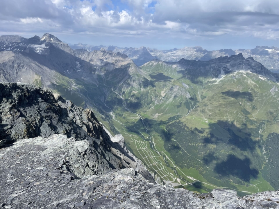 Was für ein Aussichtspunkt! Die halbe Schweiz liegt vor unseren Füssen. Fast 1‘800m senkrecht unter uns breitet sich die Wichlenalp aus (schnell ein Foto an Rekrut Jan Lukas whattsapplen), dahinter strahlen uns Hausstock, Bifertenstock und Tödi. Grossartig! Die drei Schönheiten werden uns fortan auf der dreistündigen Gratsurftour begleiten, die zum Panixerpass führen wird. Notabene: Es ist deshalb auch viel schöner, die Tour in diese Richtung anstatt umgekehrt zu begehen. Der erzwungene Abbruch letzte Woche war also definitiv kein Nachteil.
