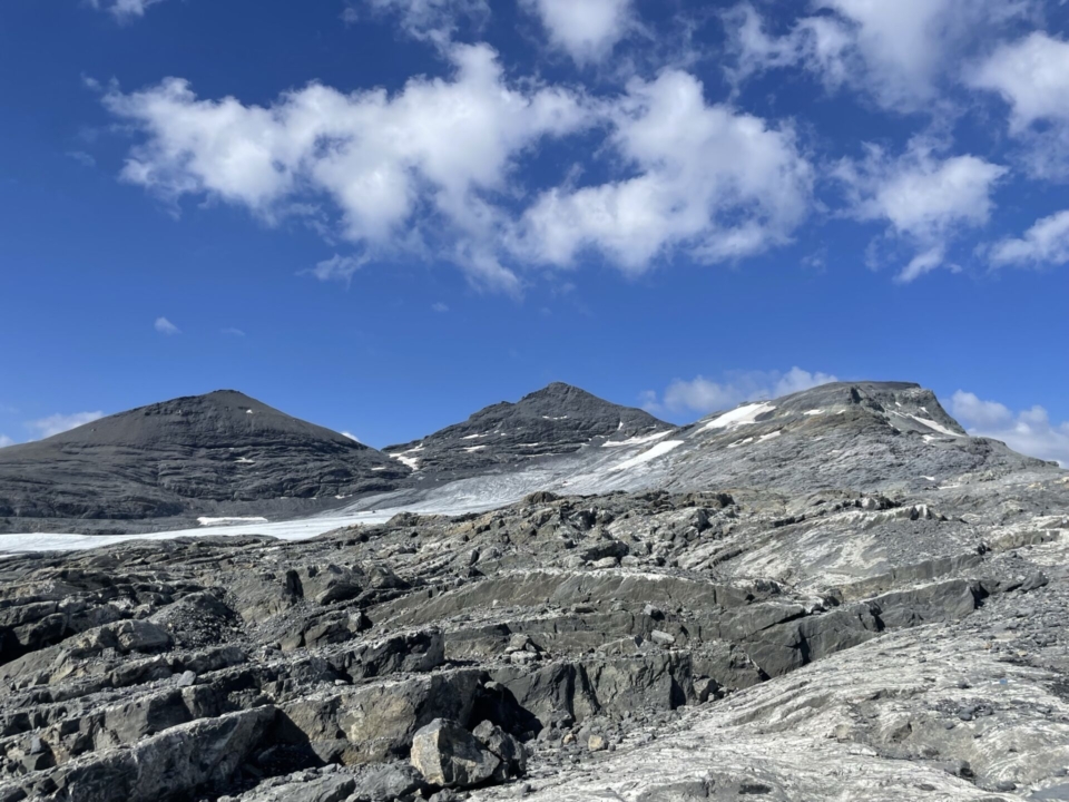 Dann erreichen wir die Höhe und damit die grosszügige, rauhe Fläche, die früher einmal gänzlich vom Vorabgletscher bedeckt war. Einen kleinen Teil davon gibt es noch, es gehört zum Laaxer Skigebiet. Der Felsboden ist überall aufgerissen und mit Spalten durchsetzt, sehr speziell und fotogen. Grund genug für eine kleine Pause – und erneutes Energiemanagement.