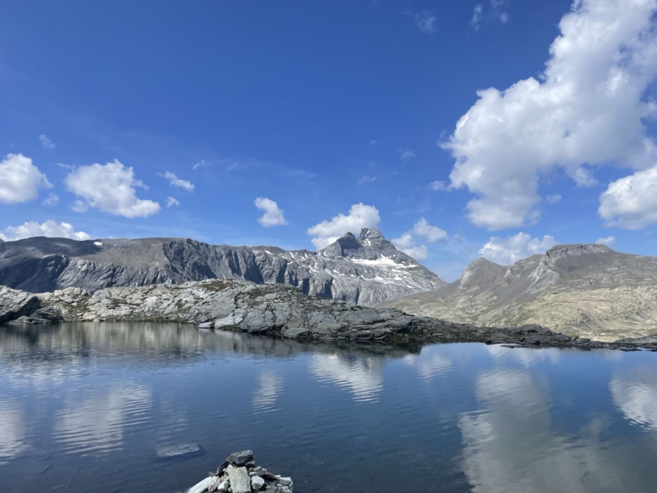 Grosse Freude bereitet uns auch der kleine See, der uns am Ende der Traverse unter dem Rotstock erwartet. Es ist nicht nur ein fotogener Ort für den Hausstock, sondern auch ein guter Ruheplatz vor dem langen Abstieg zur Wichlenalp. Wir trinken viel, es ist ziemlich warm geworden. Und wir bestätigen uns gegenseitig, wie kurzweilig diese Tour bis jetzt war, und sind froh, dass die Beine so gut mitgemacht haben.