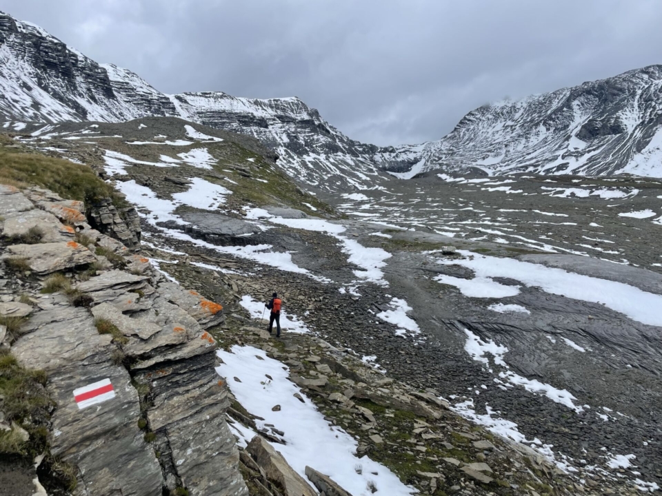Die gestrige Tour auf das Kistenstöckli – bzw. die Sicht von dort auf unser heutiges Wandergebiet – hatte es schon klargestellt. Das würde nichts werden heute mit dem geplanten Alpinwandern bis 3’100m. Zuviel Schnee hatte die Kaltfront der letzten Tage abgeladen. So brechen wir eher gemütlich von der Bifertenhütte auf und machen uns an die Alternative. Wir watscheln von der Hütte hinunter zum Kistenpassweg und biegen bald nach Osten in das Seitentälchen ab, dass uns zur Falla Lenn bringt, den Übergang zur Cavorgia da Vuorz. Hier breitet sich unter dem Muttenstock ein weites Hochtal aus, das bis noch nicht vor allzu langer Zeit von einem Gletscher bedeckt gewesen sein muss. So fühlt sich auf jeden Fall das Gelände an. Der Pfad über die steinigen Böden ist nicht immer eindeutig, aber die Route ist gut rot-weiss markiert und bietet keinerlei Schwierigkeiten. Im Gegenteil, es läuft sich hier abwechslungsreich und das Gelände ist eindrücklich. Reto stimmt zu, wir sind schon wieder zufrieden.