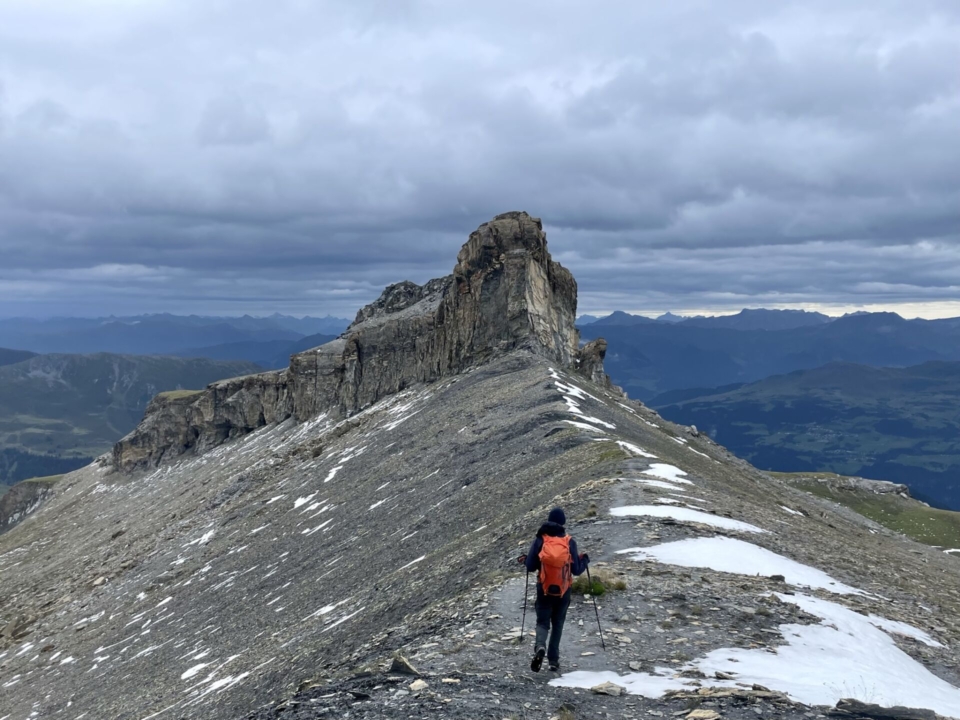 Eine gute Stunde brauchen wir für den Schwenker durch diese weite, wilde Ebene. Dann erreichen wir die Kante zur nächsten Geländekammer unterhalb des Piz Ners und damit den Hinterhof des Hausstocks – das Val di Pigniu (Panixertal). Dieser aussichtsreiche Gratrücken (siehe Foto unten) endet mit einem neckischen Gipfelchen (Crap Tgietschen), unter dem Sattel wird es Zeit für eine erste Trinkpause. Die wenigen Regentropfen stören kaum, aber der „Wetterbucheli“ lag definitiv daneben.