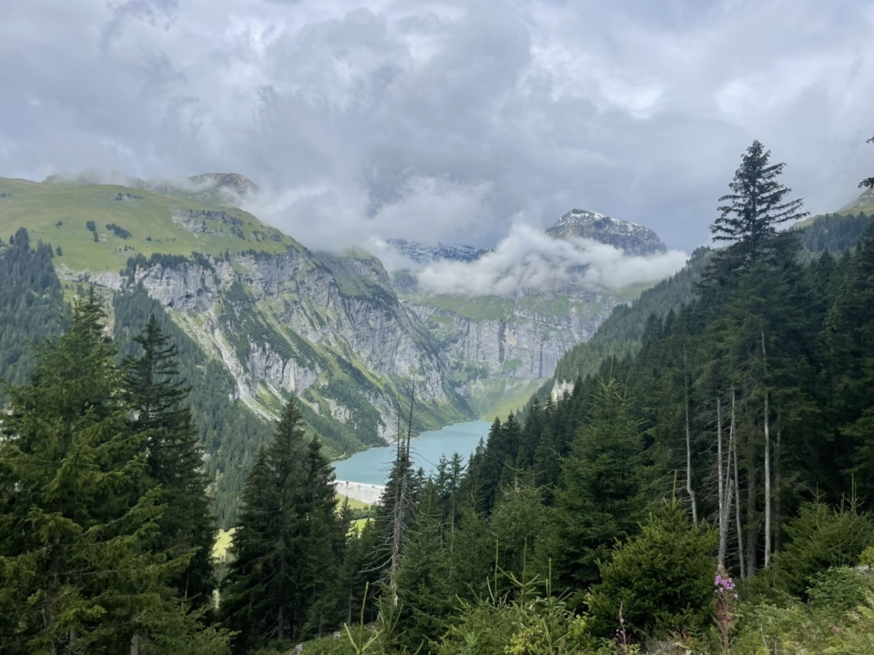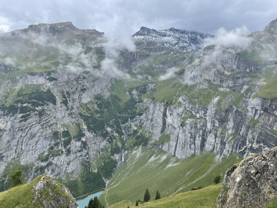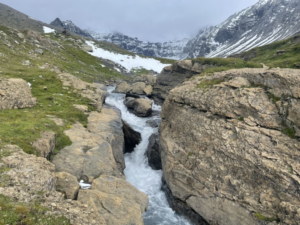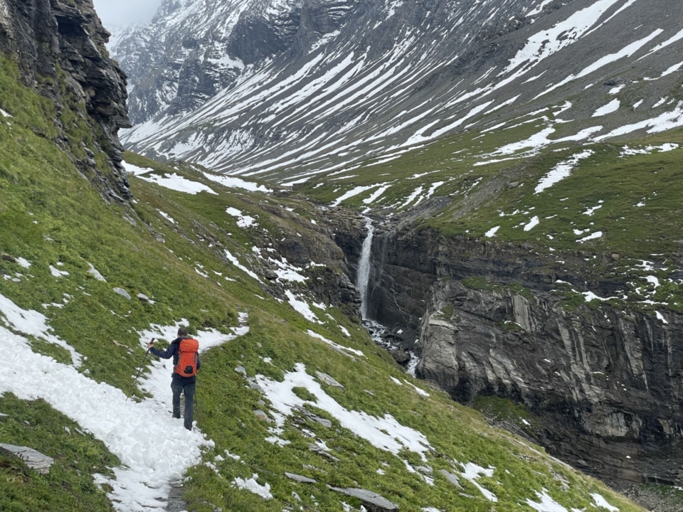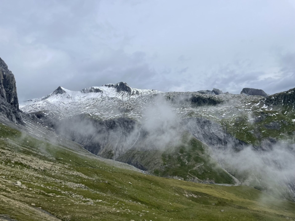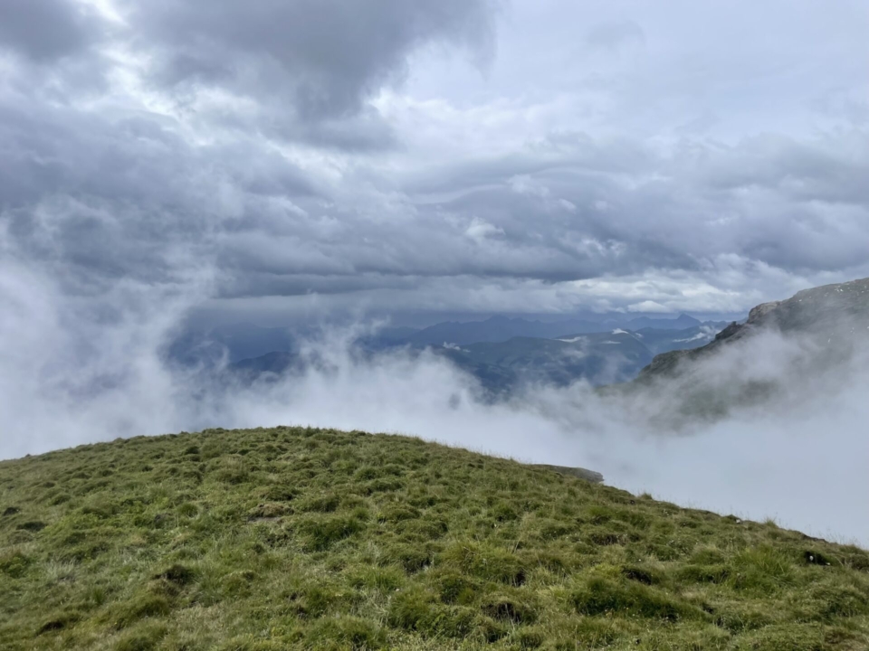 Nun folgt der nächste Schwenker im Auf und Ab, diesmal aber viel grüner. Der Hausstock (wie gerne denke ich an seine Überquerung zurück!) steckt jedoch dicht in den Wolken. Das Highlight sind deshalb die eingegrabenen Bäche und ein stolzer Wasserfall. Auf der Fil di Fluaz, dem Übergang zur nächsten Geländekammer, grasen zu unserer Überraschung Rinder (auf fast 2400m).