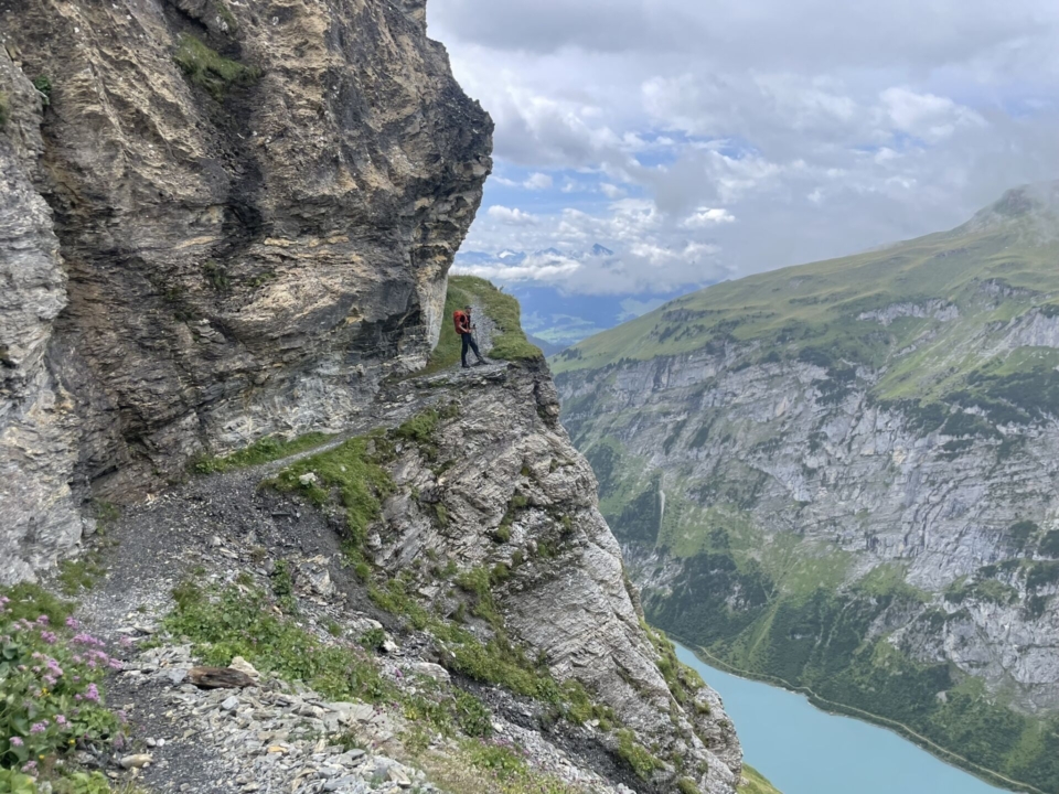 Wir bedauern noch einmal, die Tour nicht wie geplant fortsetzen zu können und machen uns an den Abstieg in die Surselva. Dafür kommen wir in den Genuss einer grossartigen Kulisse, die sich uns bei der spektakulären Bänderpassage hoch über dem Panixersee bietet. Und hier soll General Suworow im Oktober 1799 mit seinen fast 22’000 Soldaten, Pferden und Maultiere durchgezogen sein? Wir lesen auf einer Tafel, dass nur 15’000 von ihnen in Panix angekommen sind … was für ein grausames Drama muss das gewesen sein. Unvorstellbar. Wieviel Überbleibsel liegen wohl noch heute in den unzugänglichen Schluchten unter uns? Und wie haben die damals 70 Einwohner wohl reagiert, als diese ausgezehrten Menschen in ihrem Dorf ankamen?