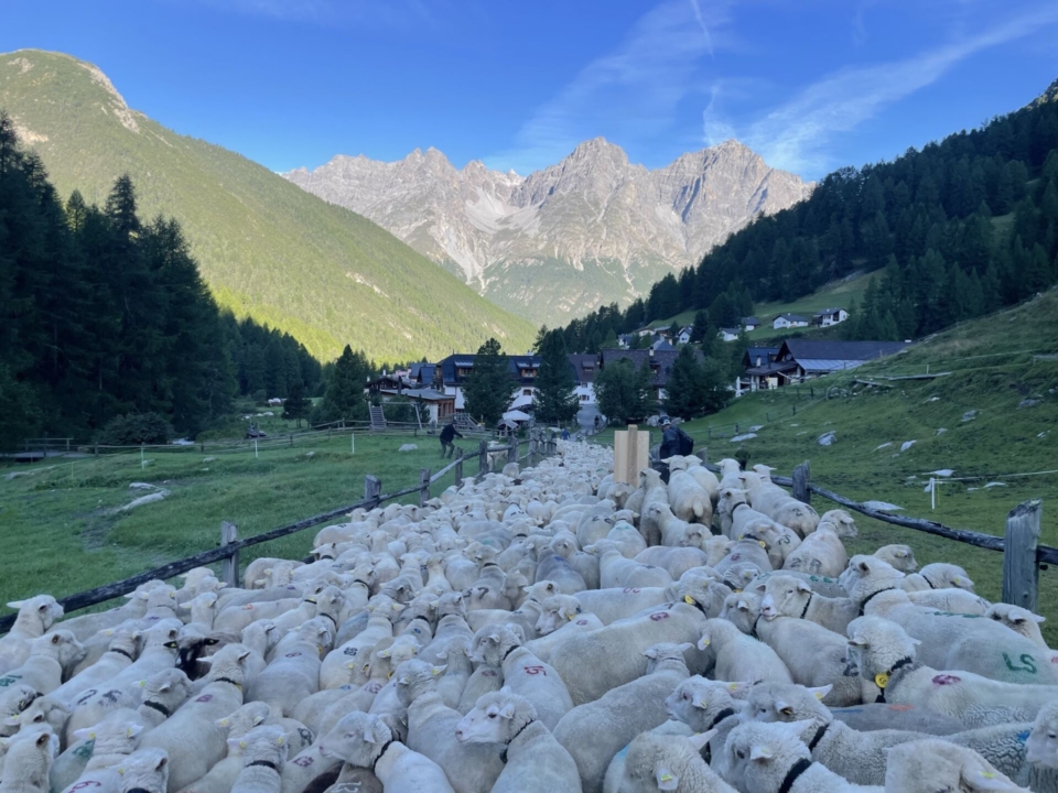 Es ist frisch, als ich um 8.15 in S-charl dem Postauto entsteige. Zum Glück habe ich meine Soft-Shell-Jacke eingepackt, das herrliche Wetter hätte mich fast davon abgehalten. Ich schüttle mich, um warm zu bekommen und folge dann dem Alpweg ins Val S-charl. Die Wärme kommt schnell, aber nicht nur von der Bewegung, sondern auch von der Freude über die rund 500 Schafe, die sich mir wie eine Lawine nähern. Sie drängen sich durch die immer enger werdenden Seitengatter am Wegrand. Ich hüpfe auf einen grossen Stein, um das Spektakel aus nächster Nähe, aber sicherer Höhe zu erleben. Cool.
