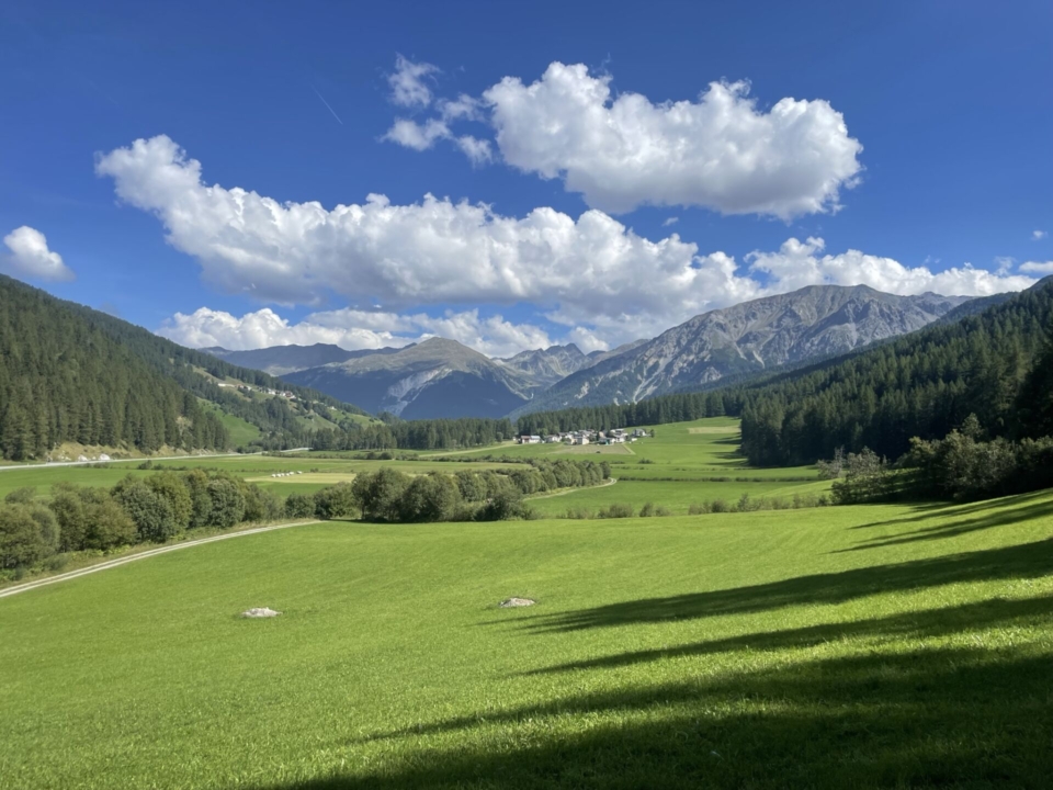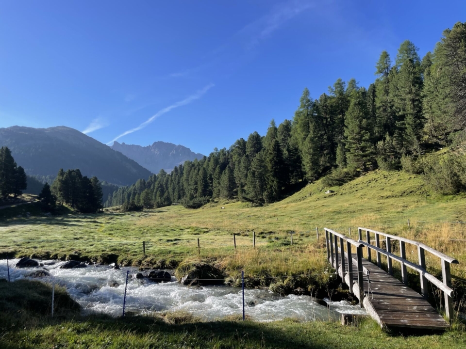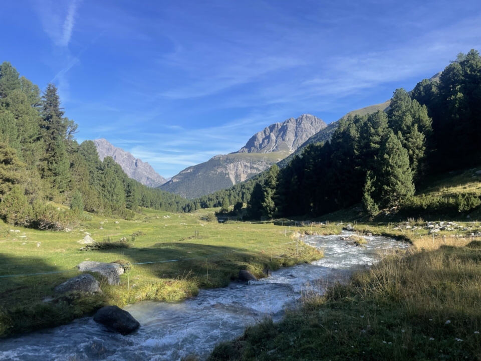 In dieser euphorischen Stimmung mache ich mich an den Abstieg nach Lü. Zunächst über den schmalen Pfad mit Blick übers Tal zum Lai da Rims, bald wieder über ein Fahrsträsschen. In Lü steuere ich auf den Hirschen zu, wo „Mamma Lü’s Spaghetti“ angepriesen werden. Die Portion schlinge ich genau so begeistert hinunter wie ich das Glas Rotwein geniesse, das ich mir zur Feier des Tages gönne. Danach schlendere ich zum kleinen Postbus, der mich auf den Weg nach Hause bringen soll. Das fällt mir dann aber so schwer, dass ich bei der Brücke in Fuldera wieder aussteige, um nochmals eine Stunde dem Bach entlang und über tiefgrüne Wiesen nach Tschierv laufen zu können. Mit dieser schönen Zugabe bin ich dann mehr als zufrieden, als ich den übernächsten Bus zurück über den Ofenpass nach Zernez besteige.