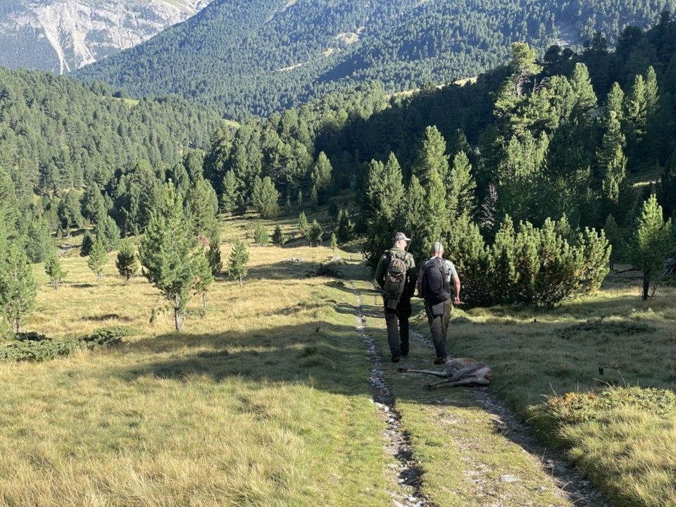 Von nun an laufe ich auf der östlichen Talseite, der (Biker-)weg bleibt westlich. Im Aufstieg zur Tamangut Dadura kommen mir zwei Jäger entgegen. Stolz präsentieren sie ihre Beute, eine stattliche Hirschkuh. Es ist heute der erste Tag der Bündner Jagdsaison, die Wirtin im Hotel hat mich gewarnt. Aber diese beiden Jäger schiessen heute nichts mehr, besonders nicht irrtümlicherweise ahnungslose Wanderer.
