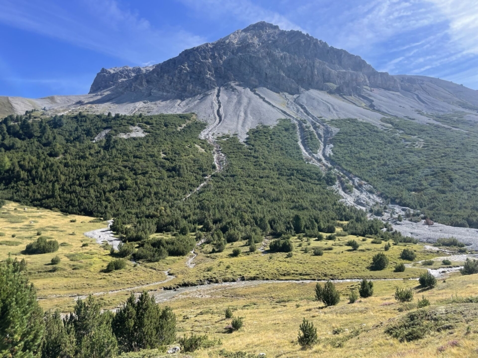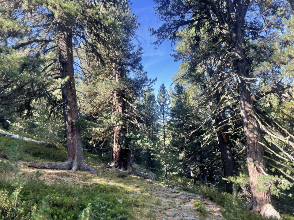 Bei der Hütte weist mich eine Tafel darauf hin, dass der nun folgende Pfad durch die God Tamangur durch einen der ältesten, geschützten Wälder dieser Gegend führt. Knorrige, jahrhundertealte Arven leben hier bis auf fast 2400m Höhe! Es seien die einzigen Bäüme, die die Kälte und die kurze Vegetationszeit aushalten. Ich bin kein Botaniker, aber das ist ein ganz schönes Stückchen Bergwelt. Überhaupt ist dieses ganze Tal eine einzige positive Überraschung. Die Weite, das Friedvolle, einfach schön. Es erinnert mich an das Val Mora und damit an den Anfang der Expedition Ost-West-Transversale vor über 5 Jahren. Ein schönes Gefühl, etwa so wie „nach Hause kommen“.