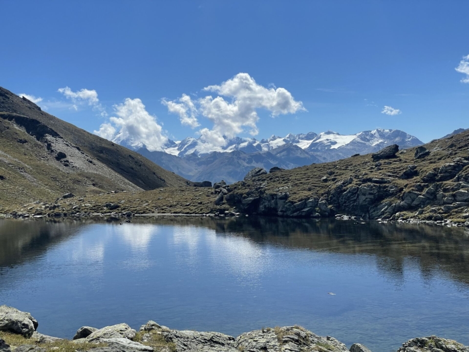 Der Pfad ist schmal und nicht immer gut sichtbar, er führt mich zu immer kahleren Flanken und schliesslich, nach einer kurzen, kräftigen Schlusssteigung, auf den Pass. Und da kommt der grosse Wow-Moment: Natürlich sind da zuerst der stolze Ortler und seine Kumpanen, die mich mit ihren mächtigen Gletschern und weissen Spitzen begrüssen. Aber da ist auch ein Seelein vor meiner Nase, das schöner nicht sein könnte. Ich fotografiere es ein Dutzend Mal von allen Seiten, die drei besten Sujets seht ihr unten.