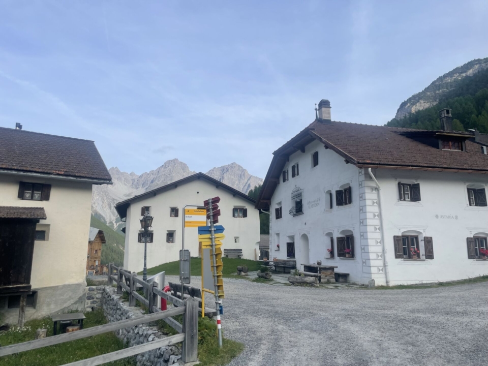 In S-charl selber ist es hingegen friedlich wie eh und je. Der Bus wendet mitten im Weiler, es ist noch kein Mensch zu sehen. Die gepflegten Holz- und Steinbauten wissen zu gefallen, auch das kleine Kirchlein setzt einen Akzent. Ich zurre meine Jacke zu, es ist frisch am frühen Morgen. Bis die Sonne im Sasvenna-Tal ihre Aufwartung macht, wird es wohl noch eine gute Stunde dauern. Der angenehme Steigwinkel des Wanderwegs ist ideal zum Aufwärmen, ich freue mich auf das Kommende, das Gefühl des priviligierten Wanderers wärmt mein Herz.
