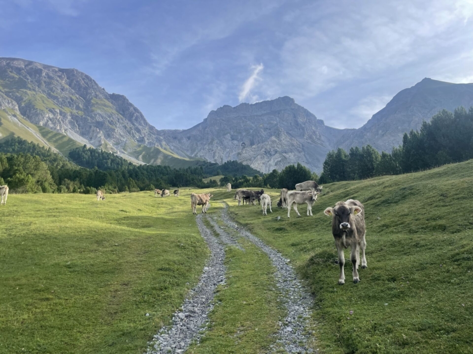 Bald erscheint hoch über mir die Fuorcla Aua, der schmale Durchgang zwischen Piz Cotsch und Piz d’Immez, der über einen blau-weiss markierten Pfad erklommen werden kann. Das sieht von weitem ziemlich steinig aus, ich bin mal gespannt. Vorerst muss ich mich kurz mit einer Herde Rinder unterhalten, die auf der Alp Sasvenna weidet. Die neugierigen Burschen lassen mich nicht einfach so durch ihre geschlossenen Reihen passieren. Ein ernster, bestimmter Wortwechsel hilft. Kurz darauf erreiche ich die Abzweigung zum Aufstiegspfad.
