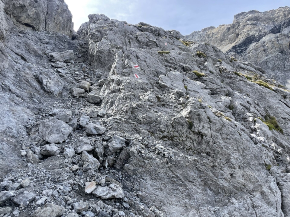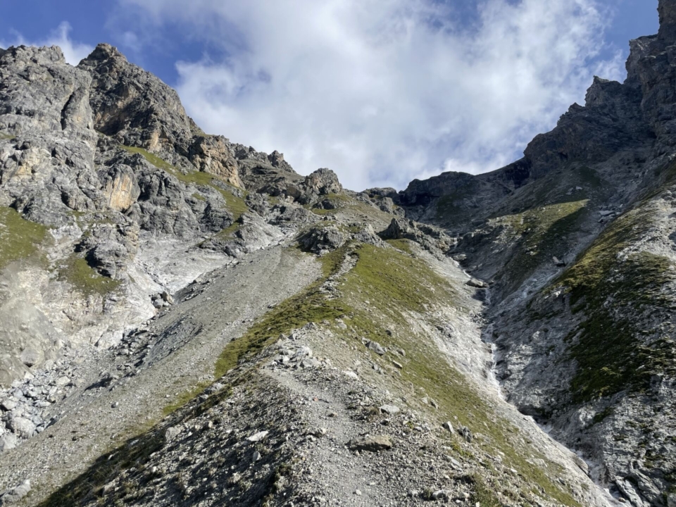 Dieser führt zunächst durch viel Grünes zu einem Bach, der sich weit in sein Tobel eingegraben hat. Eindrückliche Fotosujets gibt das! Dann wird es steiler und steiler. Das ausgewaschene Bachbett muss etwas abenteuerlich durchstiegen werden, dann wird er auf der grasigen Moräne so steil, dass die Stöcke einen grossen Teil der Arbeit leisten müssen. Christine hatte recht, als sie mir empfahl, die Tour in diese Richtung zu begehen. Ein Abstieg über diese steile Flanke mit dem rutschigen Kies ist eine ernste Angelegenheit  – dann doch lieber der Kraftakt mit den Stöcken! Irgendwann erreichte ich die Felsen, wo der Weg kettengesichert ist. Das ist zwar ganz nett, aber weiter unten hätten diese Dinger mehr genützt. Tant pis – der anstrengende Aufstieg in diesem wilden Gelände ist höchst kurzweilig und macht Spass. Nur immer wieder etwas anhalten, Luft holen und Puls senken ist angesagt.