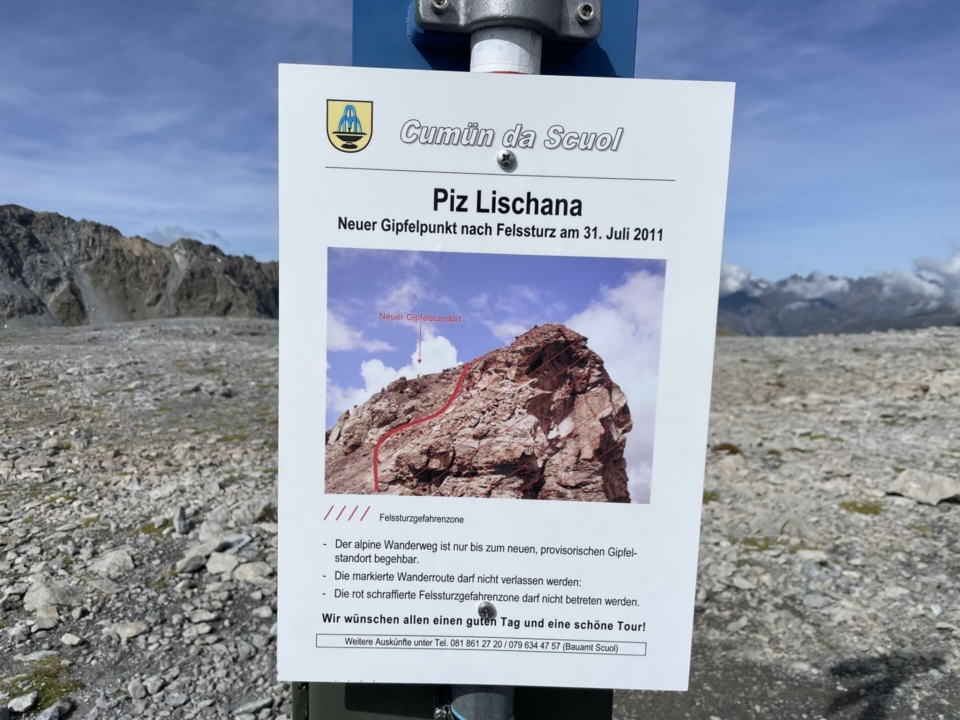 Ich bestaune den Gipfel, der vor 12 Jahren zum Teil einstürzte und seither nicht mehr bis ganz zuoberst besucht werden darf, weil er jeden Tag weiter abbrechen kann. Zu meinen Entsetzen turnen da aber ein paar Typen verantwortungslos herum. „Ohne mich!“ denke ich, und drehe um. Ich will nicht dabei sein, wenn der Felsabbruch kommt. Zunächst ärgere ich mich, aber zurück auf dem gutmütigen „Gupf“ bei einem Schluck Tee beruhige ich mich schnell. Dann halt kein „Piz Lischana minus 10m“. Sehen tue ich sowieso dasselbe auf meinem namenlosen Freund sitzend. „Dafür bleibt dir mehr Zeit für den z’Mittag in der Hütte“, sage ich mir. Gesagt, getan. Der Abstieg zur Hütte ist wiederum spannend und die Rösti mit der Engadinerwurst hervorragend.