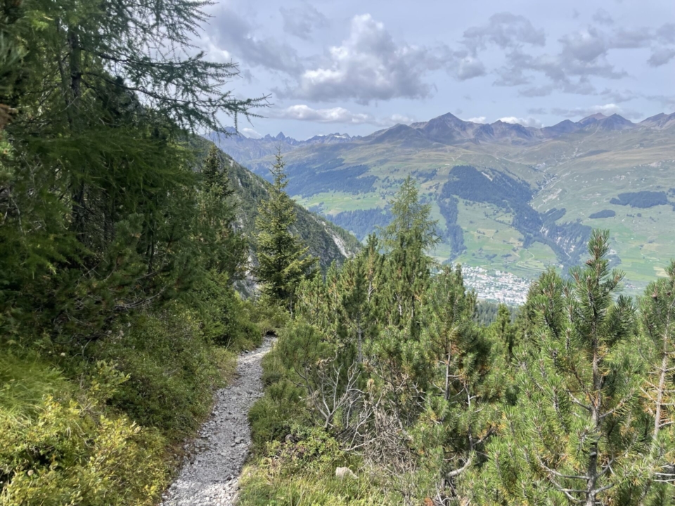 Für den Abstieg ins Tal habe ich dann keine grosse Erwartungen mehr. „1200m runter, Knie schonend“ ist angesagt. Aber das täuscht zu meiner Überraschung gewaltig. Der Hüttenweg erweist sich als höchst erfreulicher und abwechslungsreicher Schlussteil der Tour. Er ist nicht zu steil angelegt und führt stetig von einer in die andere Vegetationszone. Nach den Blöcken und das Gras kommen die ersten Lärchen, dann werden diese höher und stehen dichter, noch weiter unter folgen tolle Bachübergänge, schliesslich streife ich durch einen herrlich duftenden Wald, der mich zur tiefgrünen grosszügigen Alp San Jon führt. Hier ist ein grosses Pferdezentrum (sagt man das so?) angesiedelt, im Saloon bekomme ich ein feines Panaché. Von da sind es nur noch wenige Minuten zur Bushaltestelle, denn die letzten 300 Höhenmeter hinunter nach Scuol erspare ich meinen Knien zuliebe gerne.