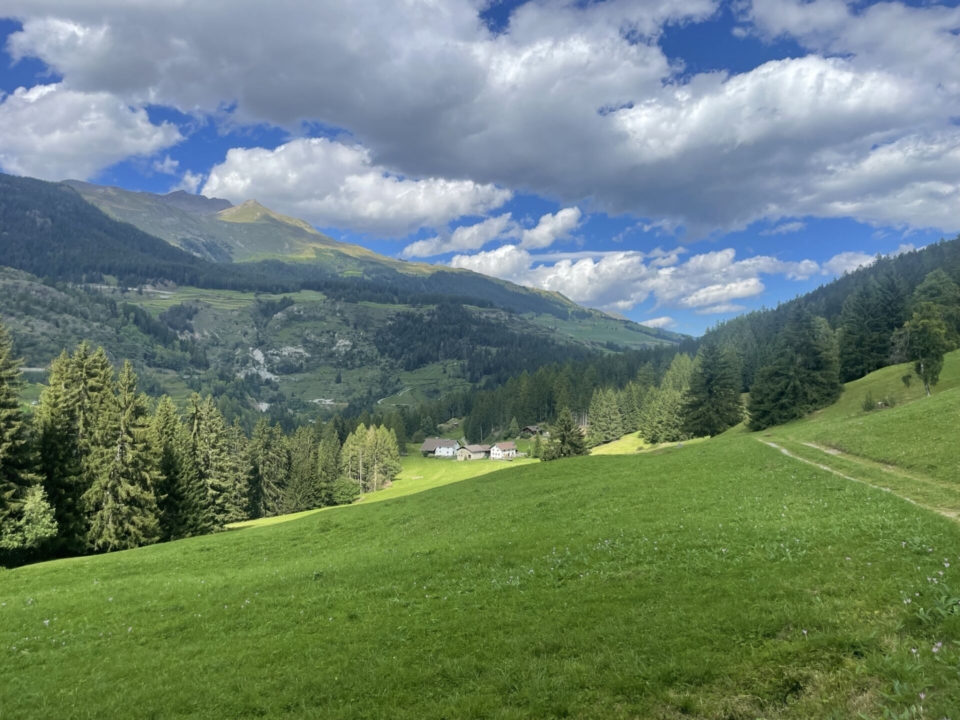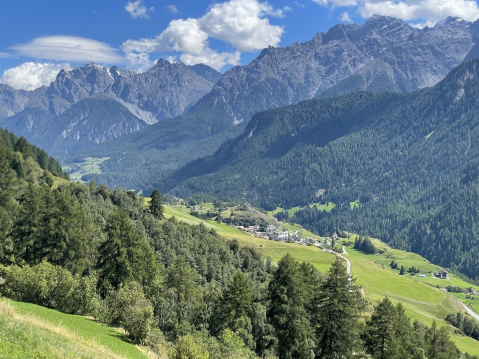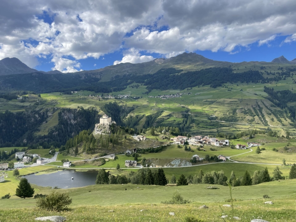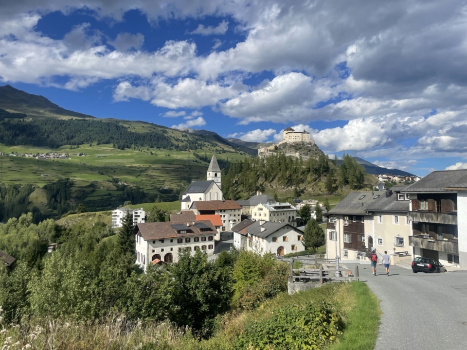 Der Pfad führt nun steil wieder hinauf und stösst auf den Höhenwanderweg der schattigen Talseite. Hier laufe ich bald wieder auf einem Fahrsträsschen, das mich durch Wald und über Wiesen, an verschiedenen sorgfältig renovierten Häusern vorbei nach Valatscha und später nach Fontana führt. Das „Fontana“ so heisst, sehe ich erst auf der Karte. Denn das dominante Wahrzeichen und der Namensgeber, der hier alles bestimmt, ist hier das Schloss Tarasp. Die stolze Burg sitzt wie ein Adlerhorst über seine Vasallenweiler. Ein schönes Bild! Wie gerne erinnere ich mich an die spezielle Führung, die ich dort vor einigen Monaten erleben durfte. Der Senter Künstler Not Vital besitzt die Burg seit einigen Jahren und hat sie zu einer Attraktion gemacht. Die Kunstsammlung ist einzigartig, ein must go.