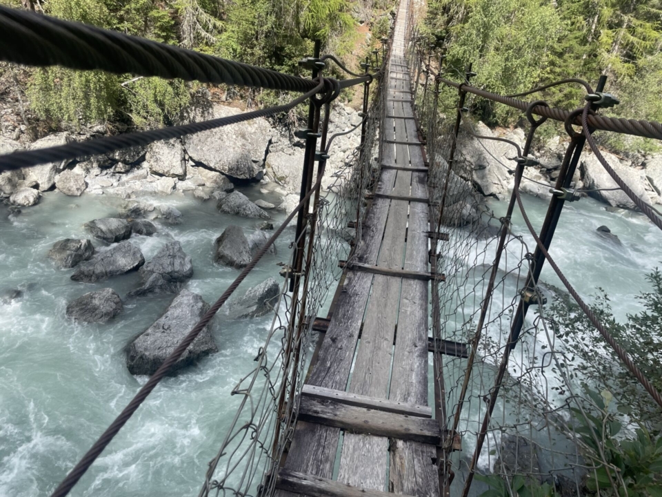 Nach dieser Leckerei tauche ich in den herrlich nach Nadeln duftenden Wald unterhalb der kunstvoll in den Hang gebauten Kantonsstrasse ein. Der Pfad führt mich in das steile untere Teil des Tals. Die Dörfer zwischen Susch und Scuol liegen nämlich alle auf Sonnenterrassen in unterer bis mittlerer Talhöhe, der Inn fliesst ganz einsam durch die Talenge. Plötzlich taucht da diese Hängebrücke vor mir auf. Das schmale Ungetüm gehört nicht zur neuesten Generation – aber das macht’s spannend! Das Traversieren erfordert schon ein kleines bisschen Nerven – es wackelt zünftig, kreuzen wäre schwierig. Die Brücke namens Punt Veidra scheint nicht viel Besuch zu haben (sie soll aber ersetzt werden, wie ich am nächsten Abend von einem Einheimischen höre).