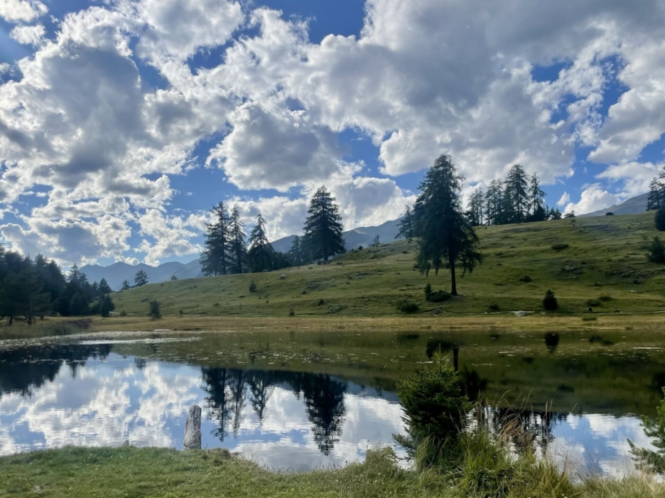 Während ich die letzte Steigung des Tages zum Lai Nair unter die Füsse nehme, bedeckt sich der Himmel zunehmend mit Wolken. Sie werfen spannende Schatten auf die Umgebung – faszinierend! Im kleinen See am Fuss des Schlosses schimmert die riesige Metallkugel von Not Vital. Lustig – aber nicht so schön, wie sich wenig später die Wolken im Lai Nair spiegeln!