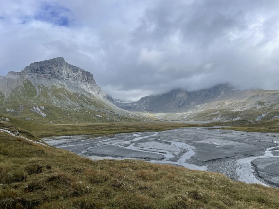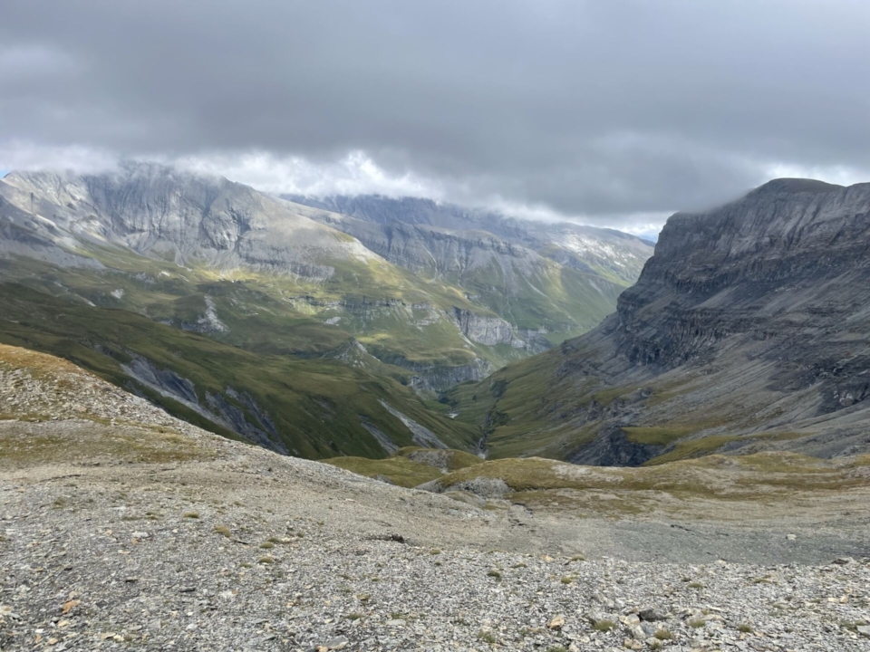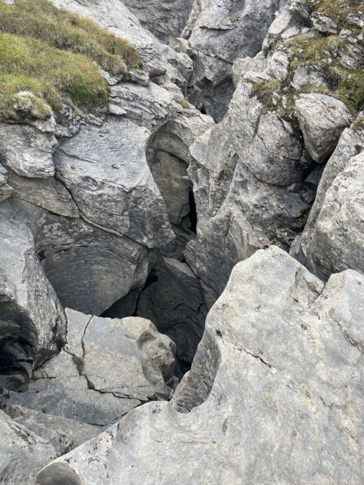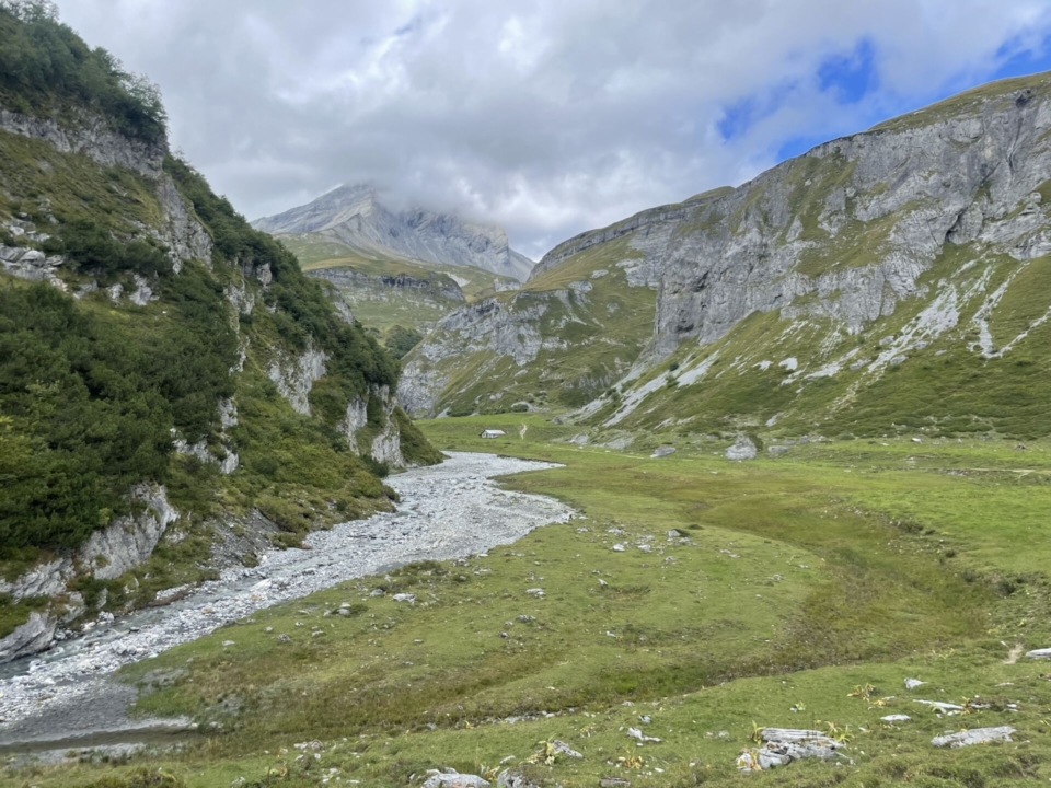 Kurz vor dem oberen Boden überschreite ich den Bach. Sehen tut man ihn allerdings nicht, so tief hat sich das Wasser in den Kalkstein eingegraben. Faszinierend! Genauso eindrücklich ist auch der Blick auf die Ebene mit ihren Wasserläufen. Doch etwas anderes passt mir gar nicht: Der Sardonapass hüllt sich in Wolken. Und das ist nicht gut. Nicht gut, weil die nur wenig mit Steinmännchen markierte Alpinwanderroute gute Sicht voraussetzt.