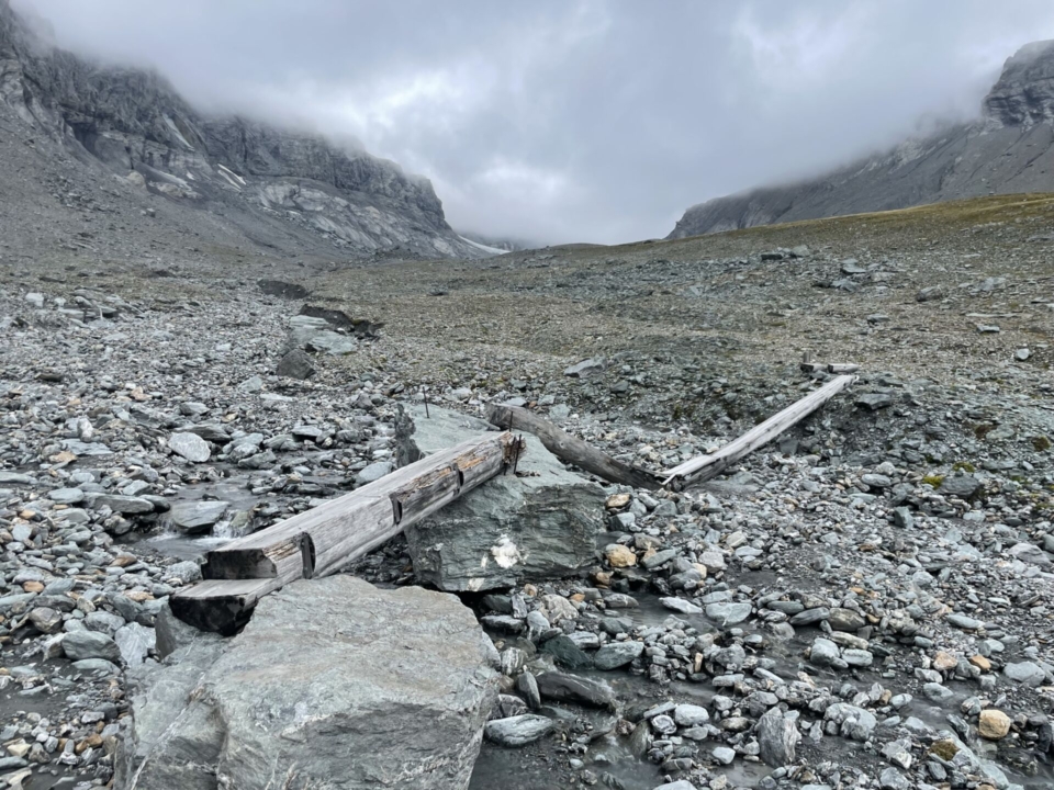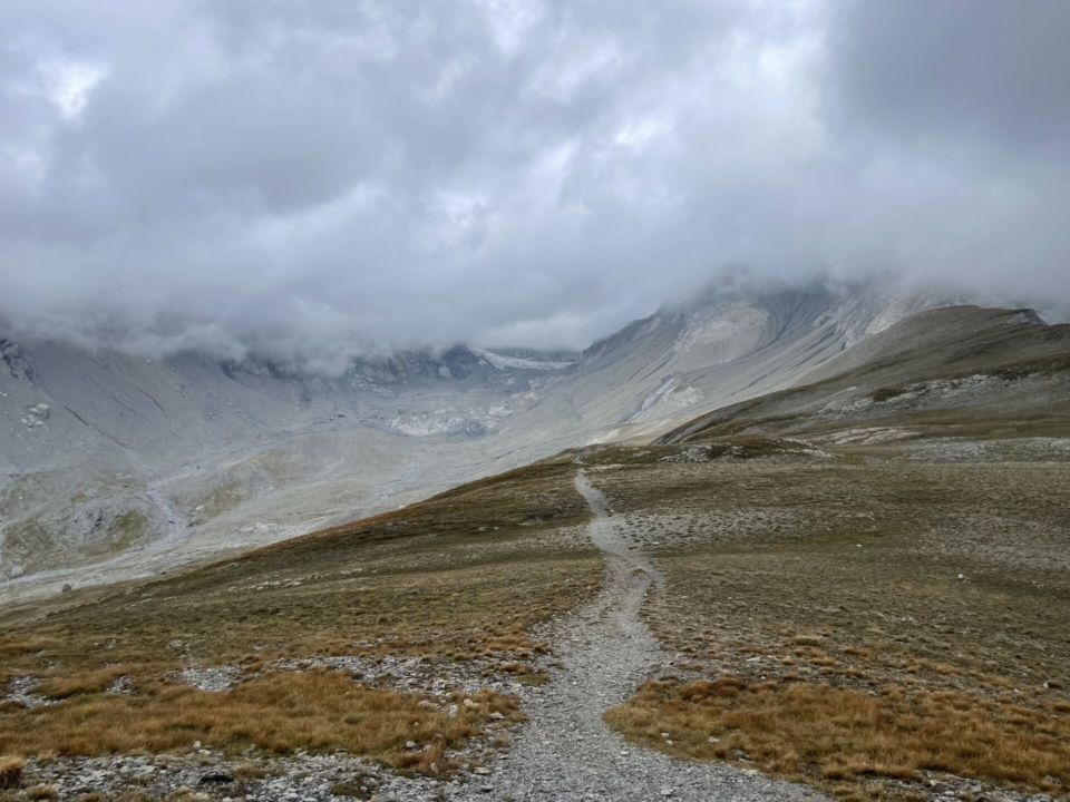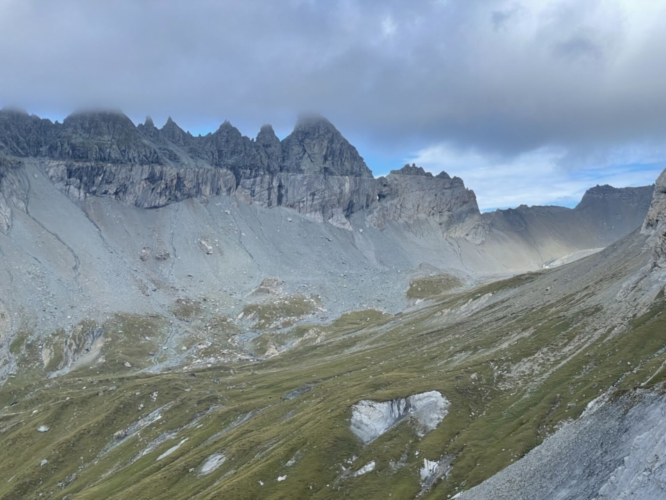 Mein geübtes Abwägen der Risiken – keine Sicht, alleine unterwegs, kein Netz – wird vom Engelchen gewonnen. So umrunde ich die Ebene und schaue mir die geplante Traversierung durch das Gletschergeröll nur von unten etwas näher an. „Ich komme wieder!“, rede ich mir gut zu und bleibe auf dem sicheren Wanderweg zur Fuorcla Raschaglius. Immer noch leicht zweifelnd, ob das wirklich nötig war – das Teufelchen motzt noch – erreiche ich den gutmütigen Rücken unter dem Fil Cassons. Zeit für eine Pause.
