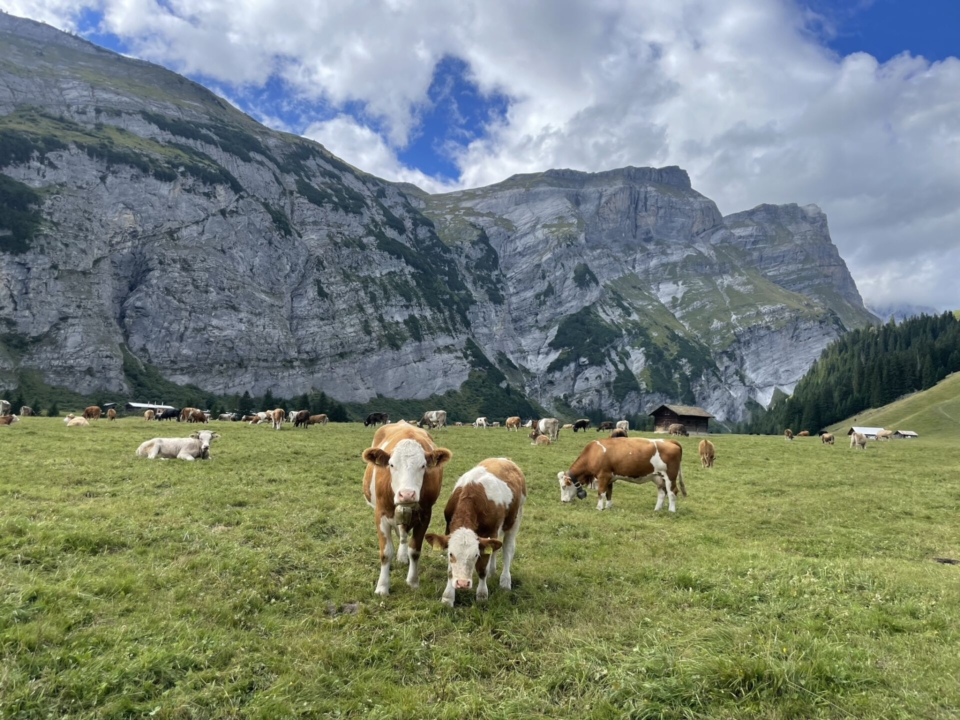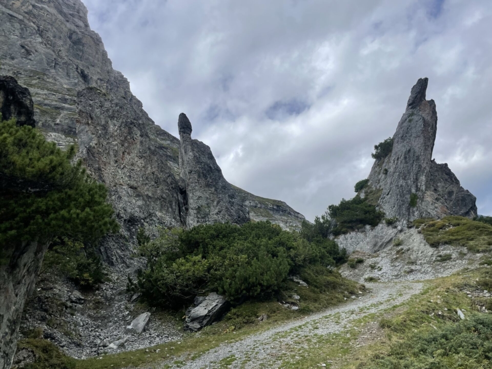Das Tal füllt sich nun vermehrt mit Bäumen, die Zivilisation kommt näher. Neckisch schmücken drei Hinkelsteine den Wegrand – wie die Hüter des gallischen Dorfes – vor dem Abstieg in die nächste Talstufe. Auch die Sonne meldet sich kurz zurück, auch wenn weiter vorne schon bedrohliche schwarze Wolken am Himmel hangen. Doch ich schaffe es trocken nach Bargis, wo ich von der Stille direkt in das fröhliche Volksfest eines Alpabzugs komme.