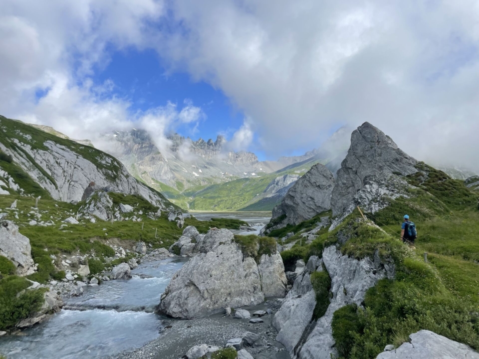 Während ich meine Blevitas und den Fleischkäse kaue, betrachte ich die Wolkenspiele und denke nach. „Come on“, denke ich – nimm dafür den Fil Cassons noch mit! Gesagt getan – doch noch bevor ich den nur etwa 150m höher gelegenen, langen Grat des Flimserstein erreiche, senkt sich die Wolkendecke über ihn. Ich drehe wieder um – und weiss nun definitiv, dass ich das Richtige getan habe. So nehme ich den Abstieg durch das Tal, beziehungsweise durch den Hinterhof des eindrücklichen Felsmassivs unter die Füsse. Der ist zunächst nicht wirklich reizvoll, zuerst Schutt, dann Gras. Das ändert sich aber schlagartig, als der Pfad in das Val Sax einmündet und ich den Bach überquert habe.