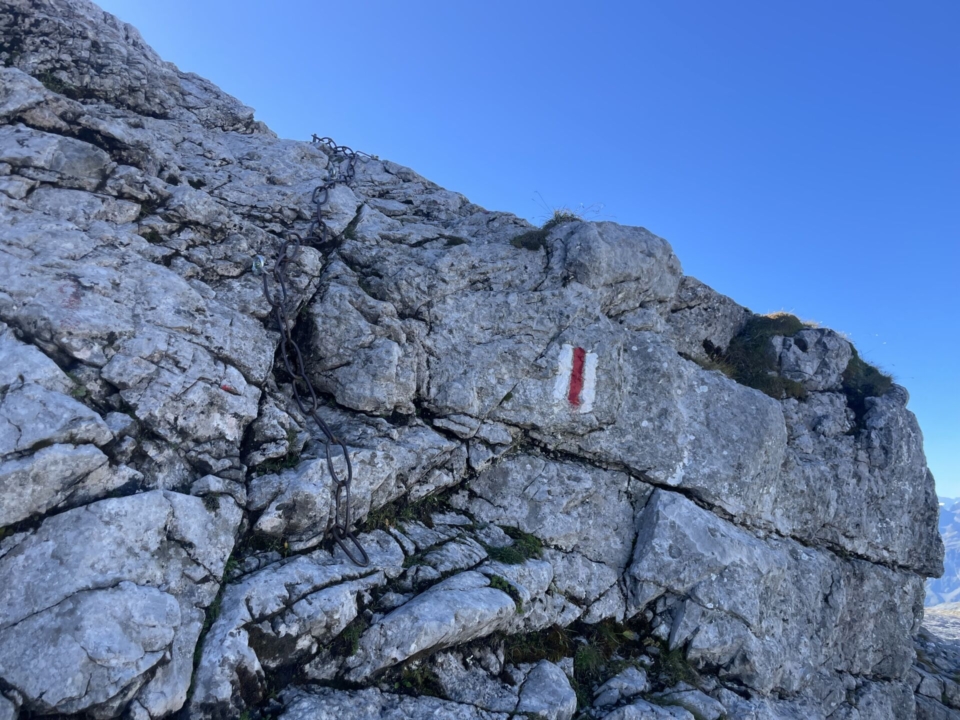 Doch wie so oft bei Bergtouren entpuppt sich aus der Nähe zwar vieles als steil, aber technisch harmlos. Der Weg ist ja schliesslich durchgängig weiss-rot markiert. Zwei wenig ausgesetzte Kraxelstellen gilt es zu passieren, beide mit Ketten gesichert. Der Pfad führt sodann über ein Schuttband auf den Grasgrat, der zwar steil, aber gutmütiger nicht sein könnte. So erreiche ich mit grosser Freude den Gipfel dieses Solitärs.