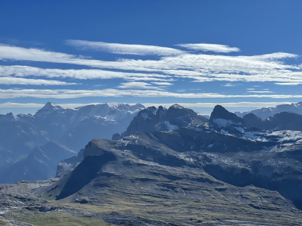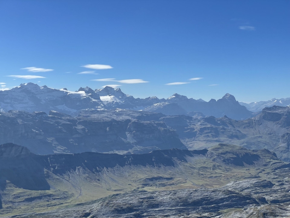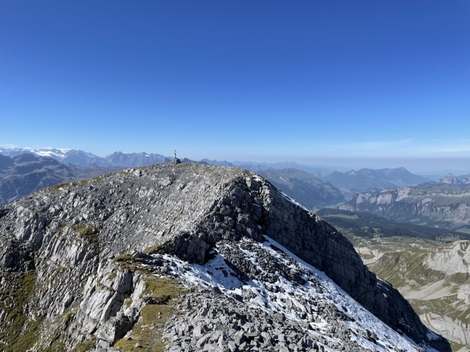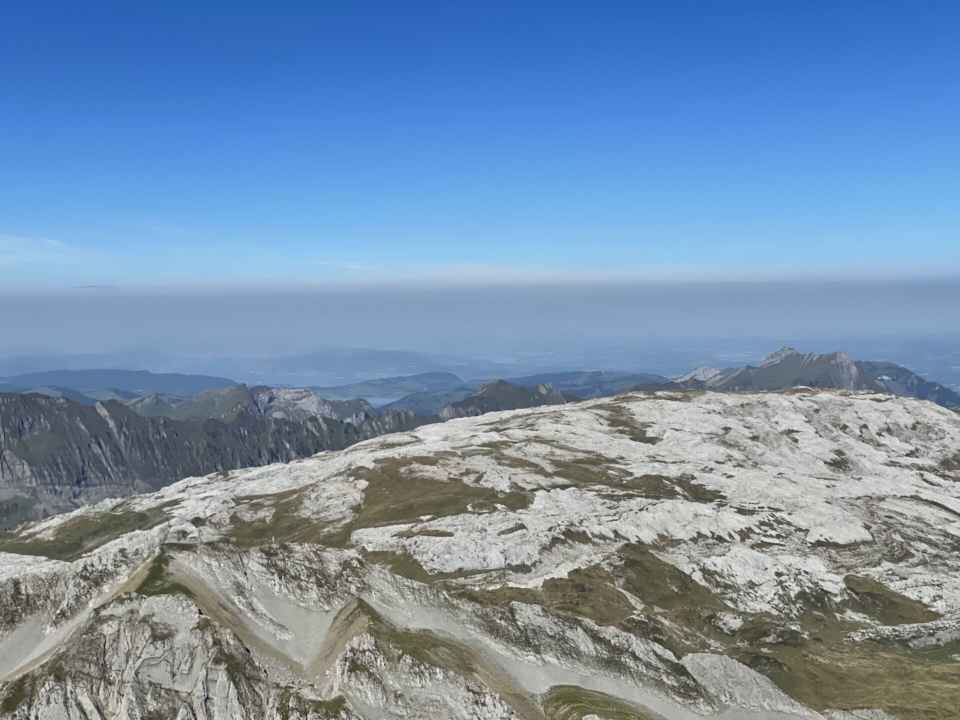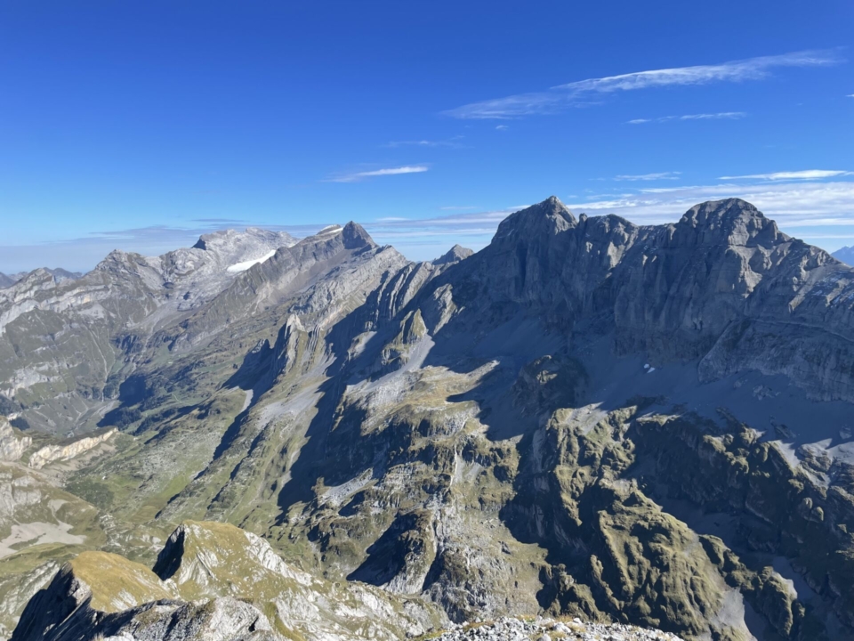 Die Rundsicht ist wahrlich spektakulär. Nah sind Glärnisch und Bös Fulen, dahinter reiht sich die kürzlich durchwanderte Vorderrheinkette auf. Der Blick führt weiter über die Urner Grössen zur vergletscherten Kröntengruppe. Und natürlich sieht man über die Silberen und den Druesberg hinaus auf den Zürichsee und bis in den Alpstein. Nicht zu vergessen die endlosen Karrenfelder direkt unter mir. Was für ein genialer Aussichtspunkt!