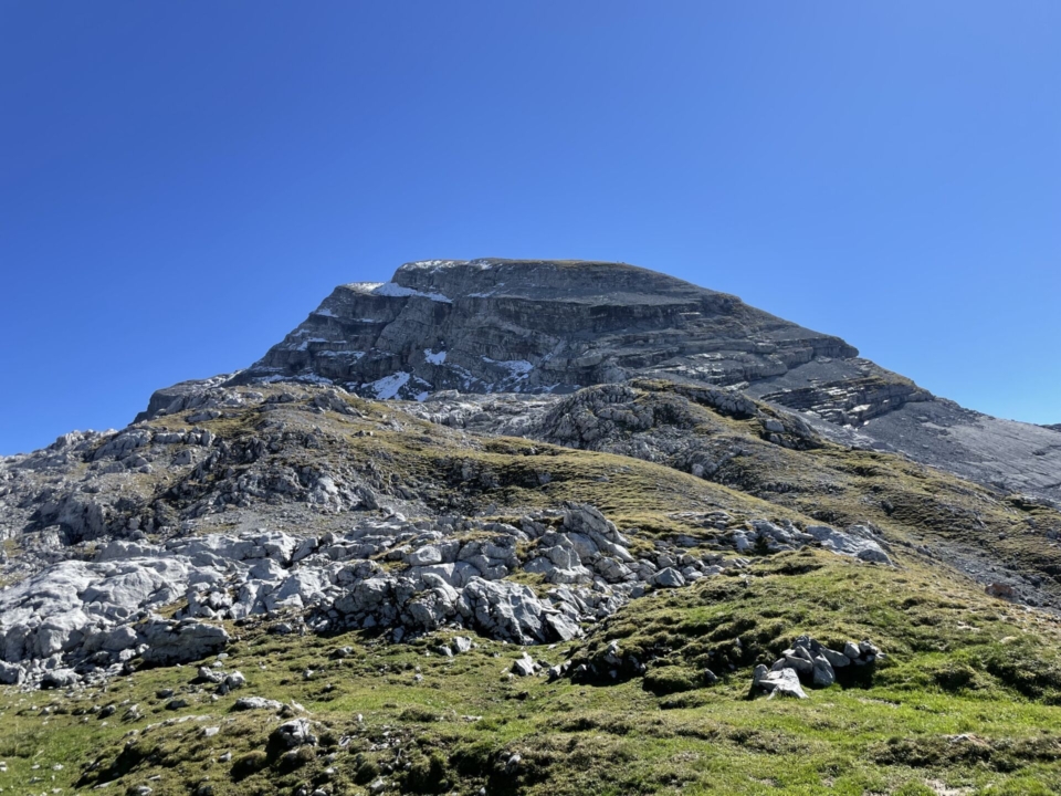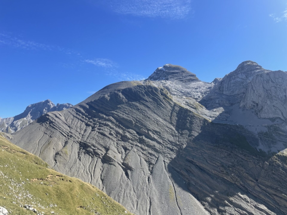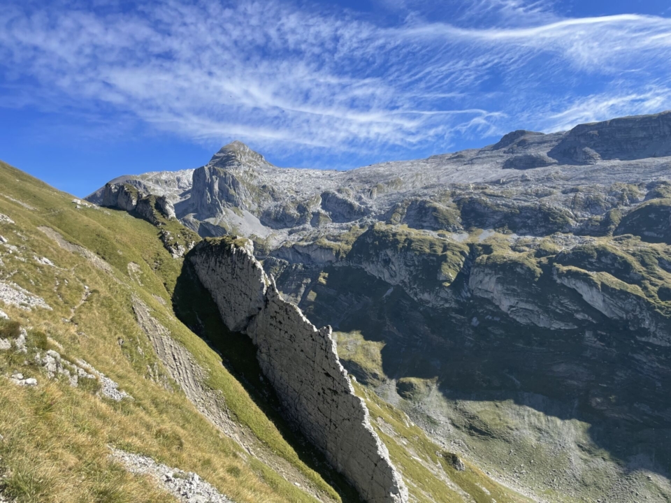 Bei der Alp Tor stosse ich auf einen perfekten Alpweg, der durch die Wildnis führend hier hoch gebaut wurde. Ich frage mich, wie das rentiert…viel zu grasen gibt es hier nicht. Am Ende des Strässchen führt ein Pfad etwas ausgesetzt auf einen Grasrücken hoch, der mich ins Rätschtal bringt – und da begrüsst mich der Pfannenstock! Es fehlen noch etwa 800Hm zu seinem Gipfel – das sieht eindrücklich aus.