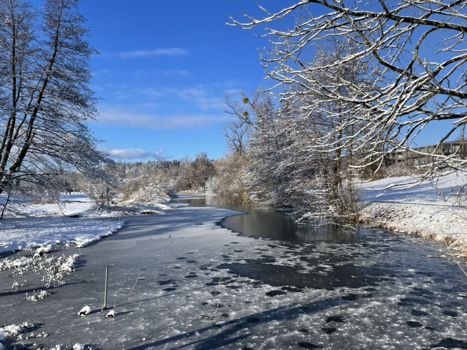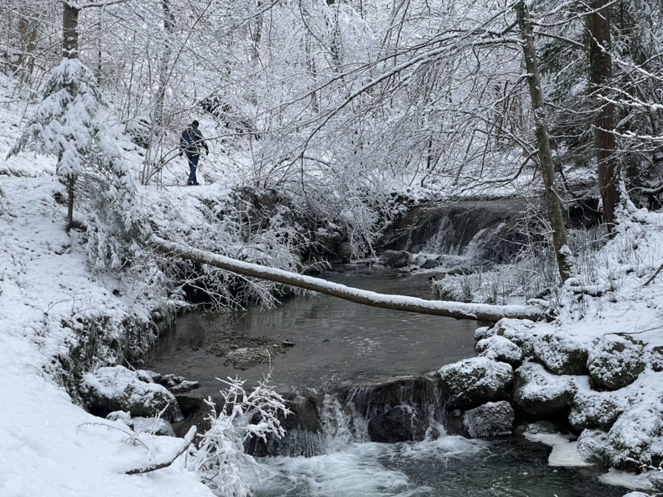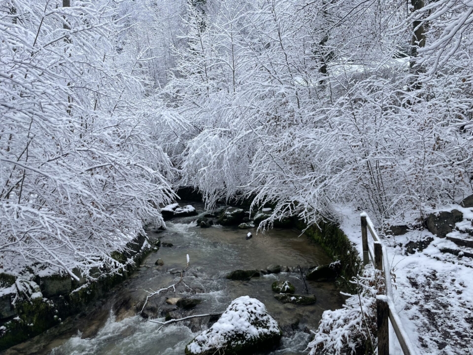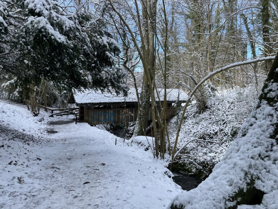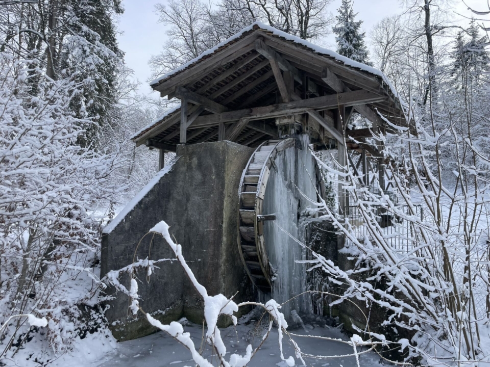 Ich bin fast alleine unterwegs, das ist an den Wochenenden nicht so. Der elegante Bachlauf ist längst kein Geheimtipp mehr. Das Teilstück bis zur Trichtenhausermühle wird von Joggern, Bikern, Hündelern und Wanderern gleichermassen geschätzt. Weiter oben wird es ruhiger – aber nicht minder romantisch. Neben der Mühle erhebt sich ein grosses Wasserrad, das einst die Energie für das Sägewerk lieferte. Der noch funktionierende Zeitzeuge ist ein Eyecatcher im Sommer, heute präsentiert er sich vom Eis erstarrt.