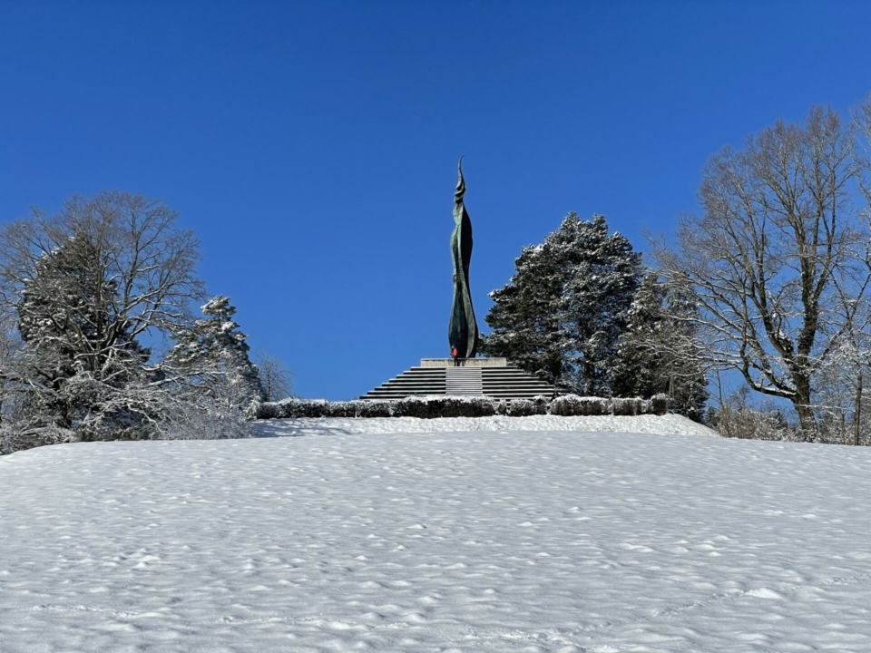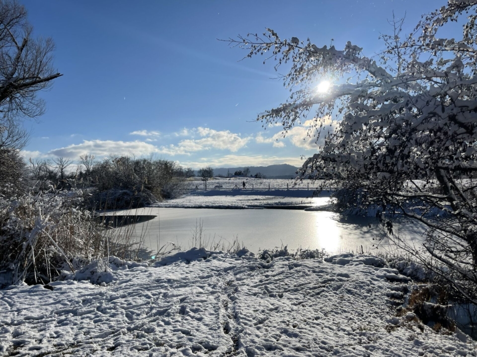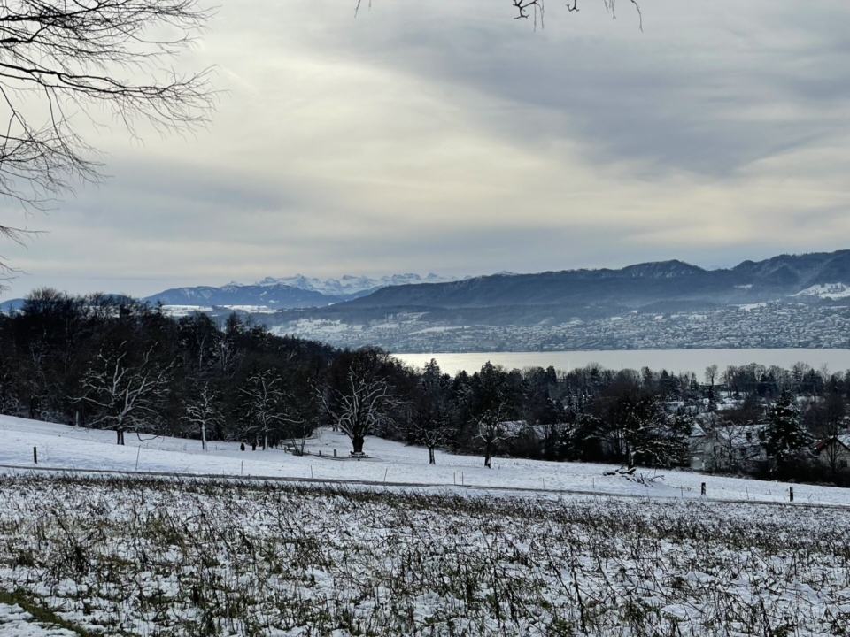 Mein Winterwandermärchen führt weiter entlang des verträumten Schübelweihers zum Rumensee. Beide könnten sich mit ihrer feinen Eisschicht und umrahmt von schneeverzierten Bäumen fast nicht romantischer präsentieren. Wunderbar! Nach gefühlten zehn Fotos traversiere ich den Wald nach Zollikon zurück, wo die Passage über die Allmend ein weiteres Highlight der Wanderung ist. General Guisan (bzw. sein Denkmal) ist zu beneiden: Der ausladende Blick auf das eingepuppte Dorf mit seinem keckem Kirchturm, dem See, die Albiskette und dem Alpenkranz ist nur einfach herrlich.