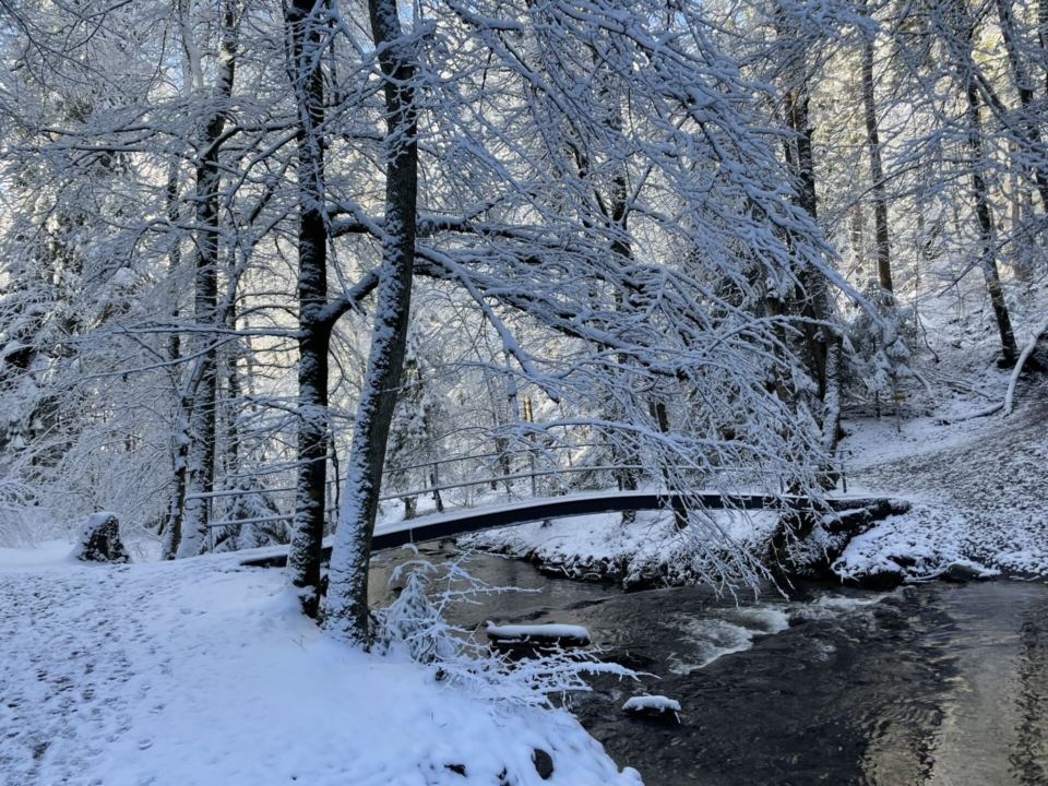 Das Wintermärchen beginnt – denn jetzt bin ich bei der „Schönen“ – das Wehrenbachtobel ist das Lieblichste seiner Art am ganzen Pfannenstiel (es gibt mindestens sieben Tobel). Und heute besonders! Der Pulverschnee knirscht betörend unter meinen Sohlen. Die mit der weissen Pracht beladenen Äste hüllen den Pfad wie ein festlicher Reigen ein. Das Wasser gurgelt dumpf, das Plätschern der Wasserfälle über die Wehren wird vom Schnee verschluckt.