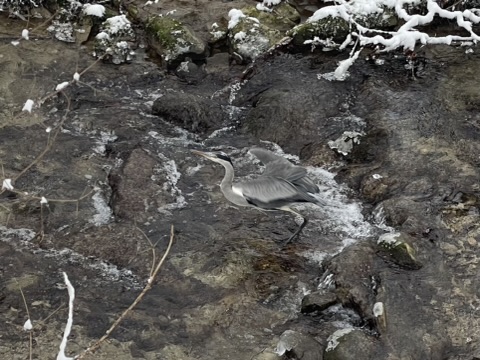 Wenig später überquere ich die Binzstrasse und betrete jenen Teil des enger werdenden Tobels, in dem ich manch freie Stunde meiner Kindheit verbrachte. Wir stauten den Bach, gruben Höhlen unter den Wurzelwerken der Bäume (bis sie umstürzten…) und rauchten heimlich „Nielä“, die am Waldrand wuchsen. Heute begegne ich einem Reiher, der sich geschickt jonglierend einen Weg durch die Äste sucht, um danach im Wasser stehend Ausschau nach Beute zu halten.