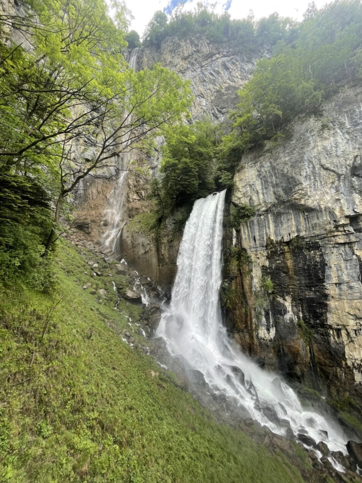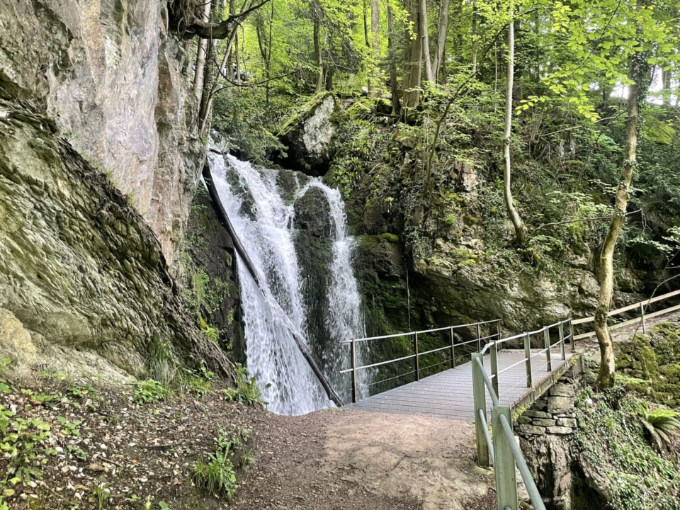 Von der Schiffsstation steigen wir zunächst zur Streusiedlung hoch. Es folgen ein paar Meter Asphalt durch eine bunte Sammlung hübscher Häuschen, auch eine Kapelle gehört dazu. Achtung: Auf keinen Fall die Abzweigung zum Wasserfall verpassen. Den kleinen Umweg mit einigen zusätzlichen Höhenmetern muss man in Kauf nehmen. Es lohnt sich. Bald spritzt uns die Gischt des untersten Wasserfalls ins Gesicht. Auf einer Schautafel nebenan werden die geologischen Geheimnisse der sogenannten „Rinquelle“ erklärt. Mehr dazu unter diesem Link: spannend!