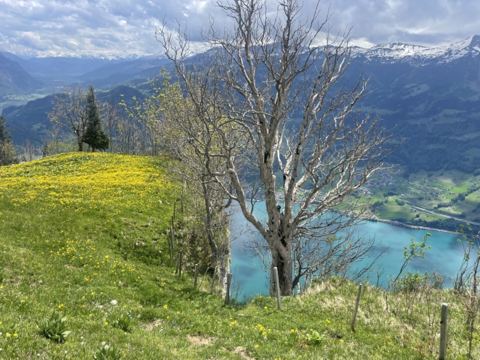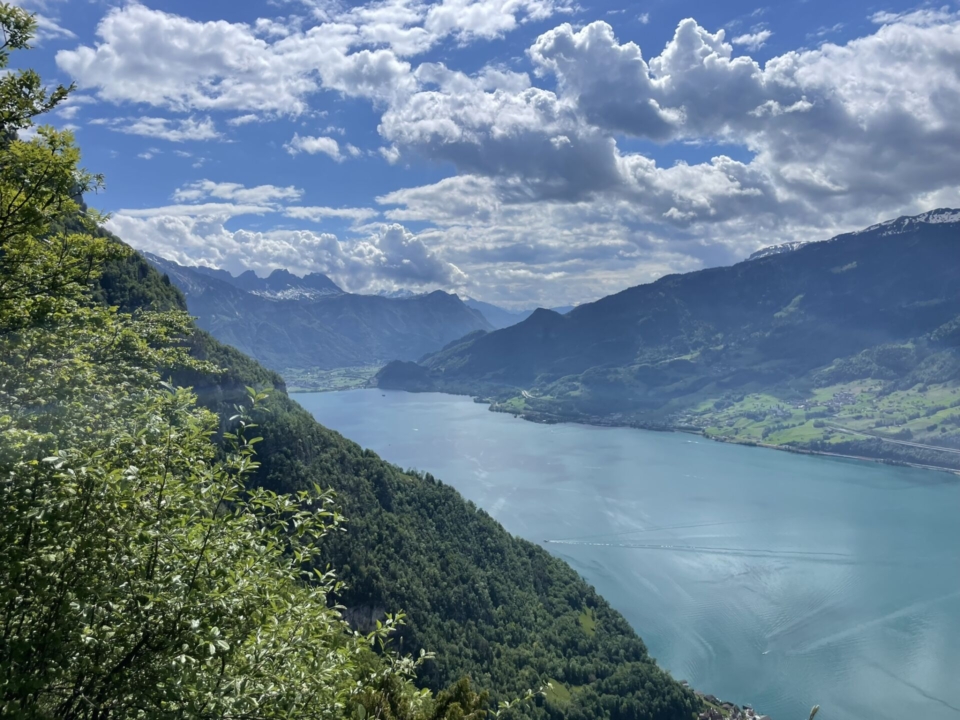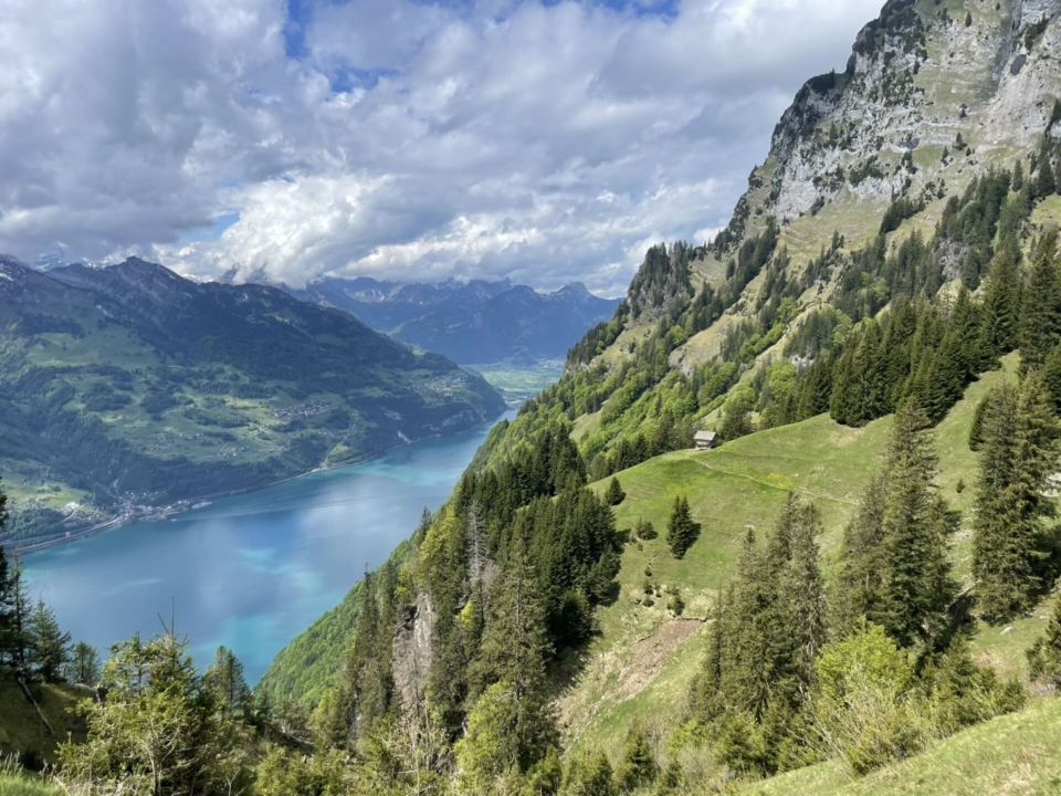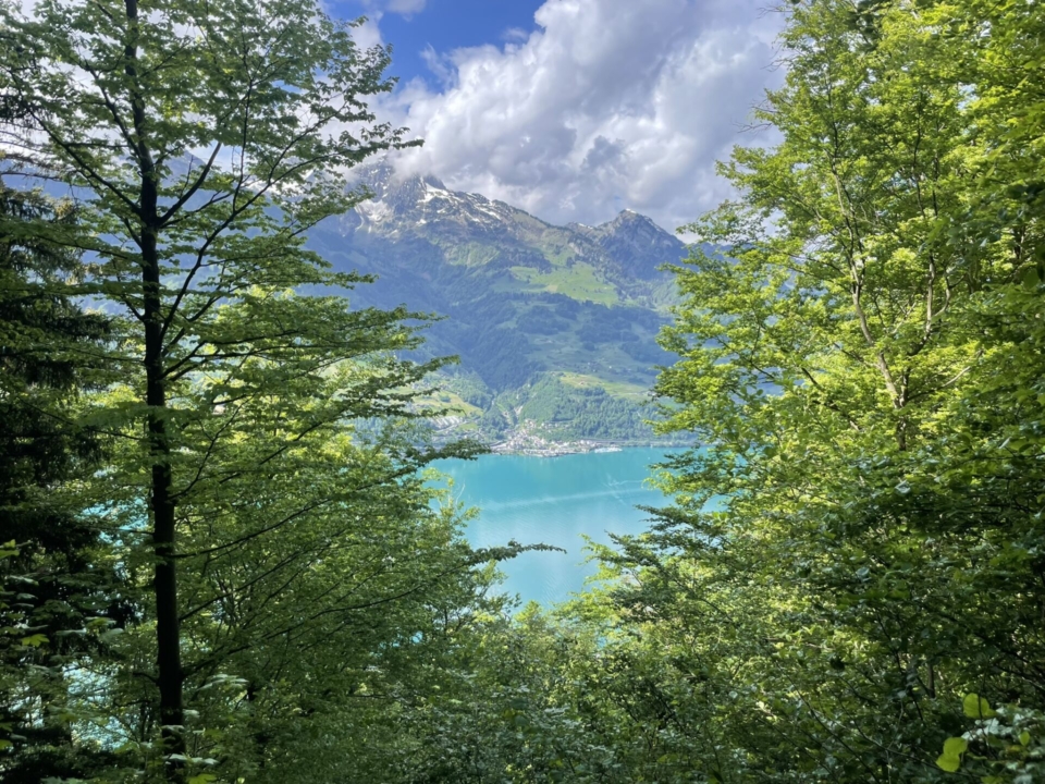 Feucht, aber vergnügt steigen wir wieder zum Wanderweg nach Quinten ab und tauchen in den Wald ein. Immer wieder öffnet sich das Grün und lässt uns auf den türkisblauen See und die darüberliegenden, schneebedeckten Berge blicken. Eine Augenweide! Es ist hier morgens noch still – das wird nicht so bleiben, denn dieser Klassiker ist einfach zu begehen und beliebt. Der Weg steigt gutmütig, dann folgt schon die Abzweigung (Pt. 708) hinunter nach Quinten.