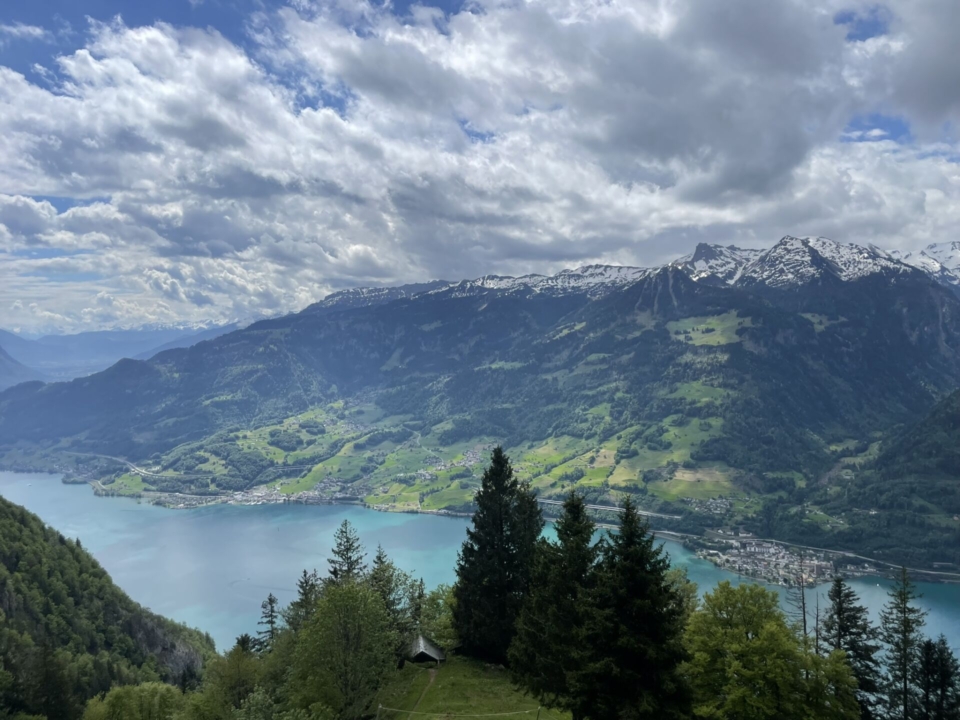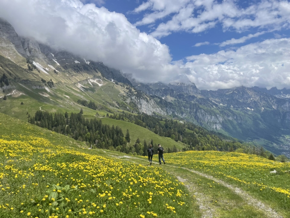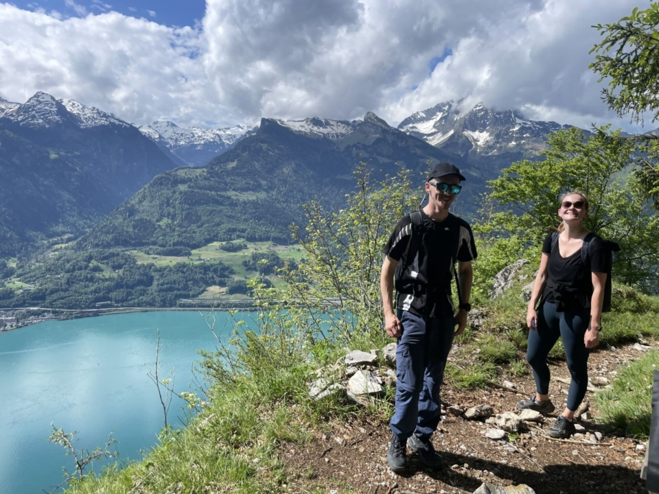 Zwei Schneefelder und eine Viertelstunde später erreichen wir den höchsten Punkt der Tour. Jetzt darf man das Highlight auf keinen Fall verpassen. Es ist der Punkt 1544, leicht oberhalb des Pfads, der den absolut perfekten Blick auf die wunderschöne Szenerie rund um den Walensee bietet. Aber aufgepasst! Nur einen Meter weiter vorne geht es dann fast senkrecht wieder runter…. Aber auf dem Grasrand dieser Kanzel sitzt es sich gut und das Picknick kann serviert werden. Wie erwartet outperformed Lea hier die beiden Männer bei weitem. Es will nicht enden, was sie da alles aus ihrem Rucksack zaubert. Wunderbar!