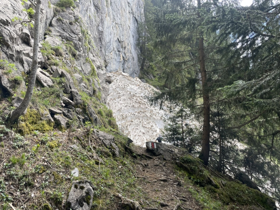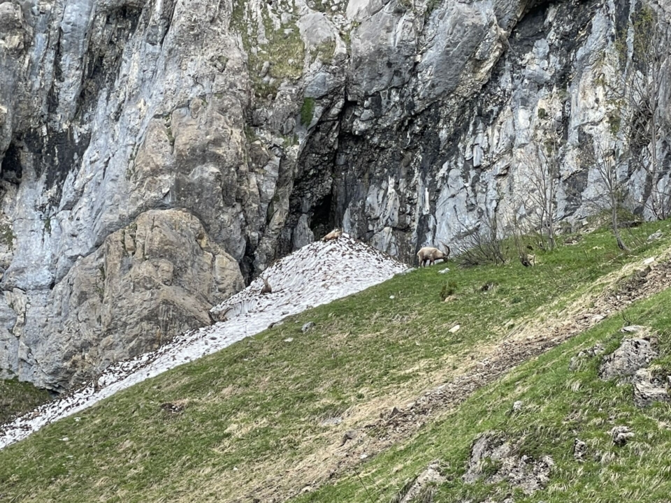 Der Pfad führt nun weiter durch offenes Gelände, das sehr steil abfällt. Zahlreiche Runsen sind noch mit Lawinenschnee gefüllt, der zum Glück weich genug ist, um kleine Tritte hinein zu stampfen. Ansonsten ist da ohne Spikes und Stöcke kein Durchkommen. Den fünf gehörnten Bergfreunden, die uns von oben auf dem Schneefeld zuschauen, ist das egal. Es sind Steinböcke, die uns mit einer Mischung von Ignoranz und Verachtung beim Schneewühlen zusehen.