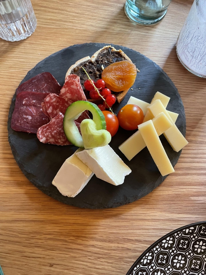 So beginnt mein heutiger Wandertag am Frühstückstisch des Nühus (Klicke auf den Link zum Video!). Hausherrin Katja bringt mir ein feines Birchermüesli und ein liebevoll angerichtetes Wurst- und Käseplättli. Das Brot ist selbst gebacken und riecht herrlich. Kaiserzmorge! Und das nach einer Nacht im Vintagezimmer mit antiken Bauernmöbeln – aber mit modernem Boxspringbett und Sicht auf den Piz Beverin. Schöner gehts nicht.