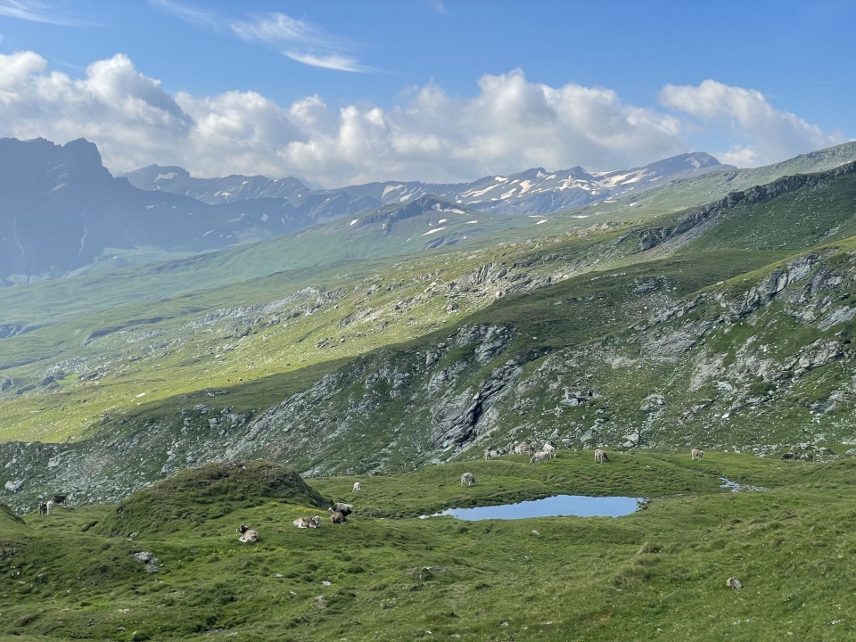 Auf der Alp Trisch oberhalb von Thalheim verabschiede ich mich von Luzia und laufe los. Weglos peile ich die Rinderpirglücke an. Von diesem Grateinschnitt zwischen Valser- und Safiental will ich später auf den Piz Tomül steigen. Es ist nicht besonders schwierig, doch habe ich das Unterfangen etwas unterschätzt. Das weglose Waten durch Alpenrosen, über spitzige Steine, durch Senken und um Felsbrocken ist anstrengend. Genauso war es damals, als Heinz und ich die Rindli in diesem anspruchsvollen Gelände suchten! Und tatsächlich finde ich die Biester auch heute an einem Tümpel. Die Kindeskinder der Zollinger-Rindli x-ter Generation?… Sie grasen friedlich und lassen sich von mir überhaupt nicht stören.