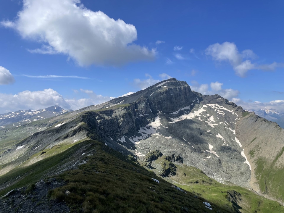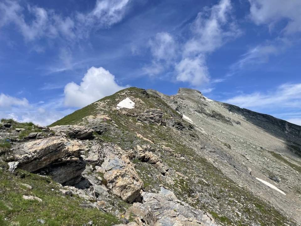 Ich bin ziemlich ins Schnaufen gekommen, als ich den Pass erreiche. Immerhin gibt es im oberen Teil dieses langen Hangs kein Gestrüpp und keine Felsbrocken mehr. Dafür grüsst jetzt ein übergrosser Felsturm auf dem Grat, den ich nicht zu überklettern wage. Also lieber wieder etwas absteigen, dann wieder steil hoch. Uff. Von jetzt an ist die Gratwanderung etwas vom Feinsten! Im leichten Auf und Ab nähere ich mich dem Fuss des Piz Tomül. Auch seine Besteigung ist einfach, zuoberst sperrt zwar einen abweisender Felsriegel, der lässt sich aber spielend überwinden. Nur ein, zwei Handgriffe sind nötig, dann steh ich auf dem Gipfelplateau.