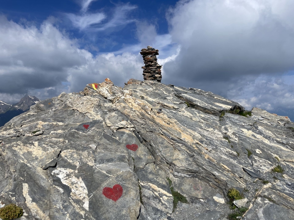 Der Piz Tomül steht völlig frei und entsprechend toll ist die Rundsicht. Aber auch der Gipfel selber ist eine Augenweide, zum Verlieben. Die Pionierpflänzchen, die den grauen Schutt schmücken, der mächtige Steinmann. Das erhebende Gefühl scheint auch andere gepackt zu haben, wie die auf den Fels gemalten Herzen unterstreichen. Auch das weckt schöne Erinnerungen.