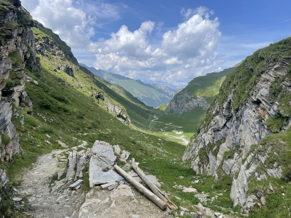 Der Abstieg erfolgt über einen guten Pfad, der zum Tomülpass hinunterführt. Er ist nicht markiert, und ich verstehe nicht, warum. Wer will denn die Wanderer von einem Besuch dieses Prachtbergs abhalten? Kurz unterhalb der Passhöhe auf der Safiental-Seite treffe ich auf den Passweg. Er ist breit und gut ausgebaut: „biker-tauglich“, wie ich gleich sehe. Die (Elektro-)Stahlrösser mit ihren Reitern sind denn auch gute Besucher dieses Übergangs.