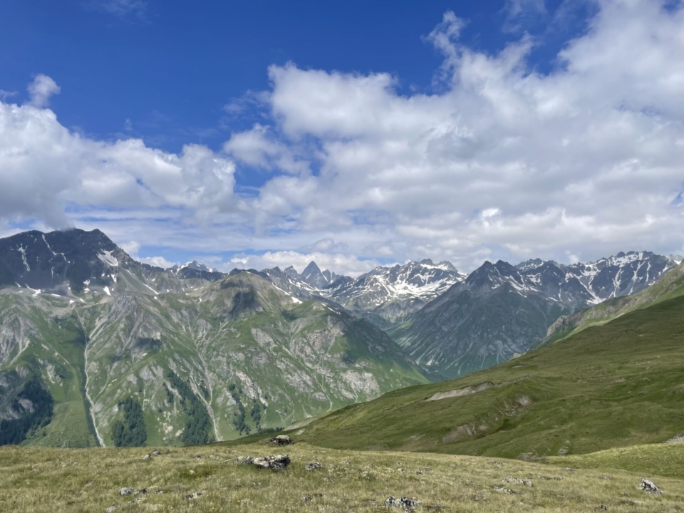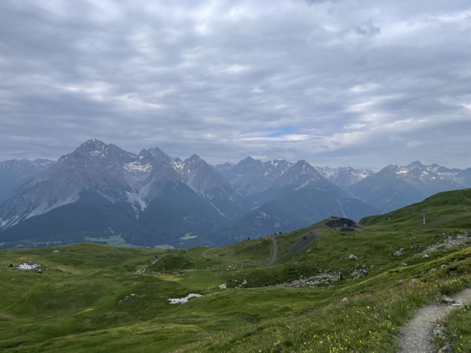 Mein Weg führt nun wieder auf breitem Pfad weiter zur Aussichtskanzel Muot da‘ l’Hom, die insbesondere eine fantastische Sicht auf den markanten Piz Buin und seine Trabanten bietet. Mit dem immer noch zahlreichen Schnee sieht das Gebirgsensemble einfach zum Anbeissen aus. Der nun folgende Abstieg zur Alp Laret muss mit den Trail-Bikern geteilt werden, die auf diesem aussichtsreichen Grasrücken sehr verwöhnt werden mit einer top angelegten Route. Ich schaue indessen lieber in die Ferne…