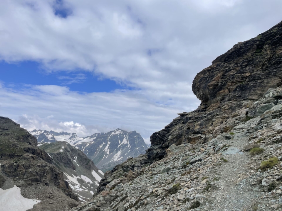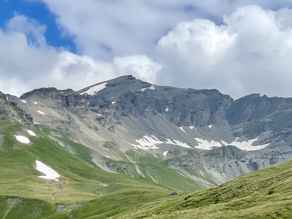 Ab der Bergstation folgt eine kurzweilige Traversierung, die zunächst zur Alp Clüvas und nur leicht steigend weiter zur Muot da l’Hom führt. Es ist noch stark bewölkt, auch wenn der Wetterbericht Sonne anzeigt. Janu, dafür ist es herrlich frisch und das Flachstück auf dem breiten Weg lädt zum Studium der Gipfelreihen auf der gegenüberliegenden Talseite ein.