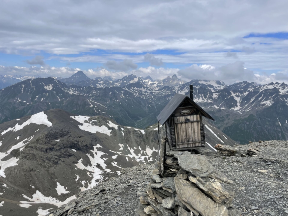Das Gipfelbuchhäuschen … ein seltenes Gipfelbild. Dahinter Piz Buin und Silvretta-Gruppe