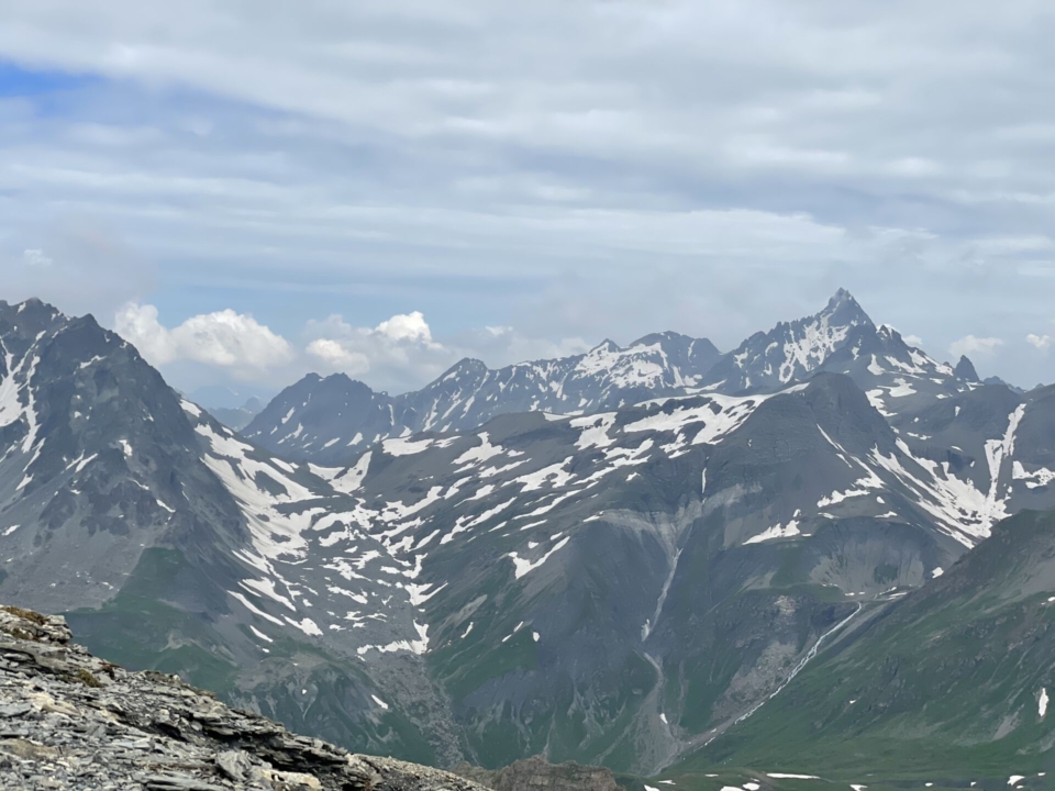 Der Piz Minschun hält, was er verspricht! Die Aussicht auf diesem freistehenden Steinklotz ist phänomenal. Im nahen Westen die lange Gipfelreihe vom Fluchthorn bis zum Piz Buin und die Silvrettagruppe, im Süden das weisse Grialetsch-Massiv, im Osten die markanten Nationalpark-Gipfel. Dahinter meine ich sogar die Ortlergruppe und einige Ötztaler-Grössen zu erkennen. Cool!
