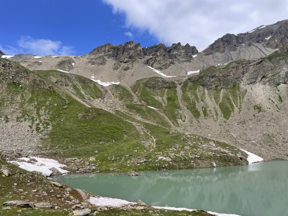 Der Minschun-See – der Pfad zum Gipfelgrat führt durch die Bildmitte steil hoch zum Sattel links der Felsen